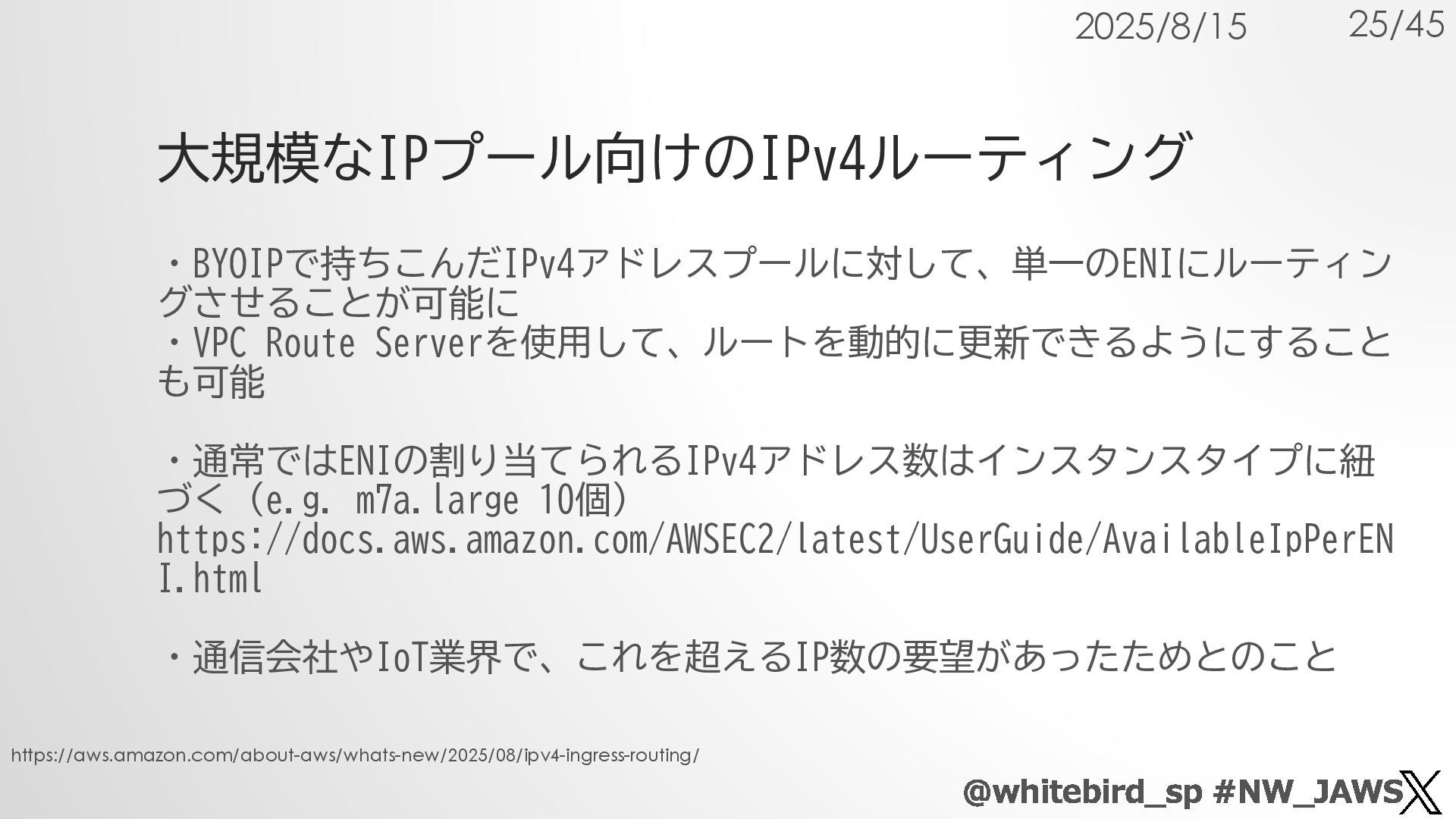 19. 大規模なIPプール向けのIPv4ルーティング @whitebird_sp #NW_JAWS 25/45 https://aws.amazon.com/about-aws/whats-new/2025/08/ipv4-ingress-routing/ 2025/8/15 ・BYOIPで持ちこんだIPv4アドレスプールに対して、単一のENIにルーティン グさせることが可能に ・VPC Route