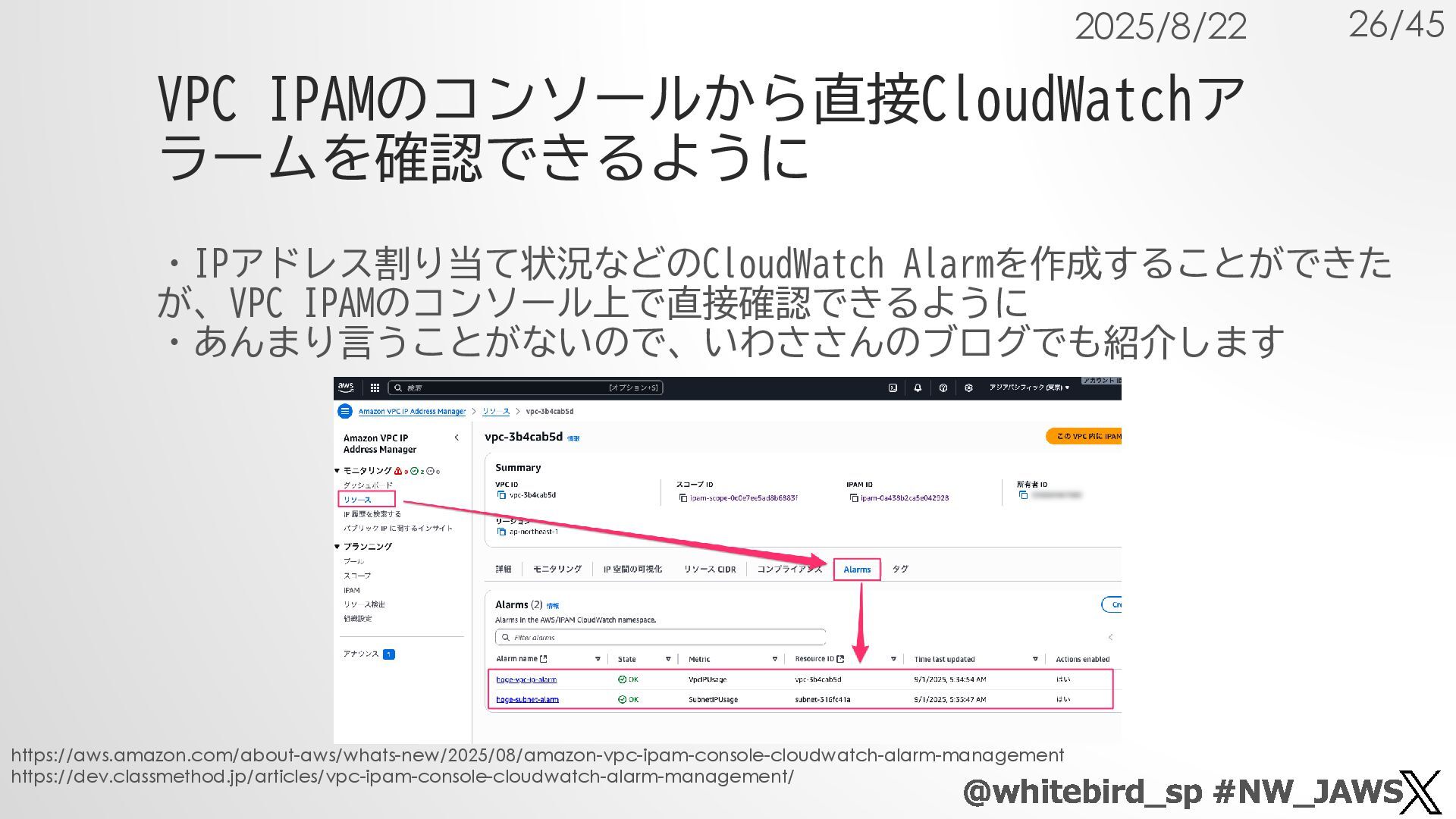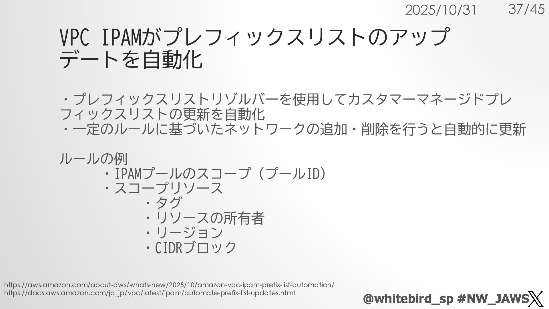 25. VPC IPAMがプレフィックスリストのアップ デートを自動化 @whitebird_sp #NW_JAWS 37/45 https://aws.amazon.com/about-aws/whats-new/2025/10/amazon-vpc-ipam-prefix-list-automation/ https://docs.aws.amazon.com/ja_jp/vpc/latest/ipam/automate-prefix-list-updates.html 2025/10/31 ・プレフィックスリストリゾルバーを使用してカスタマーマネージドプレ