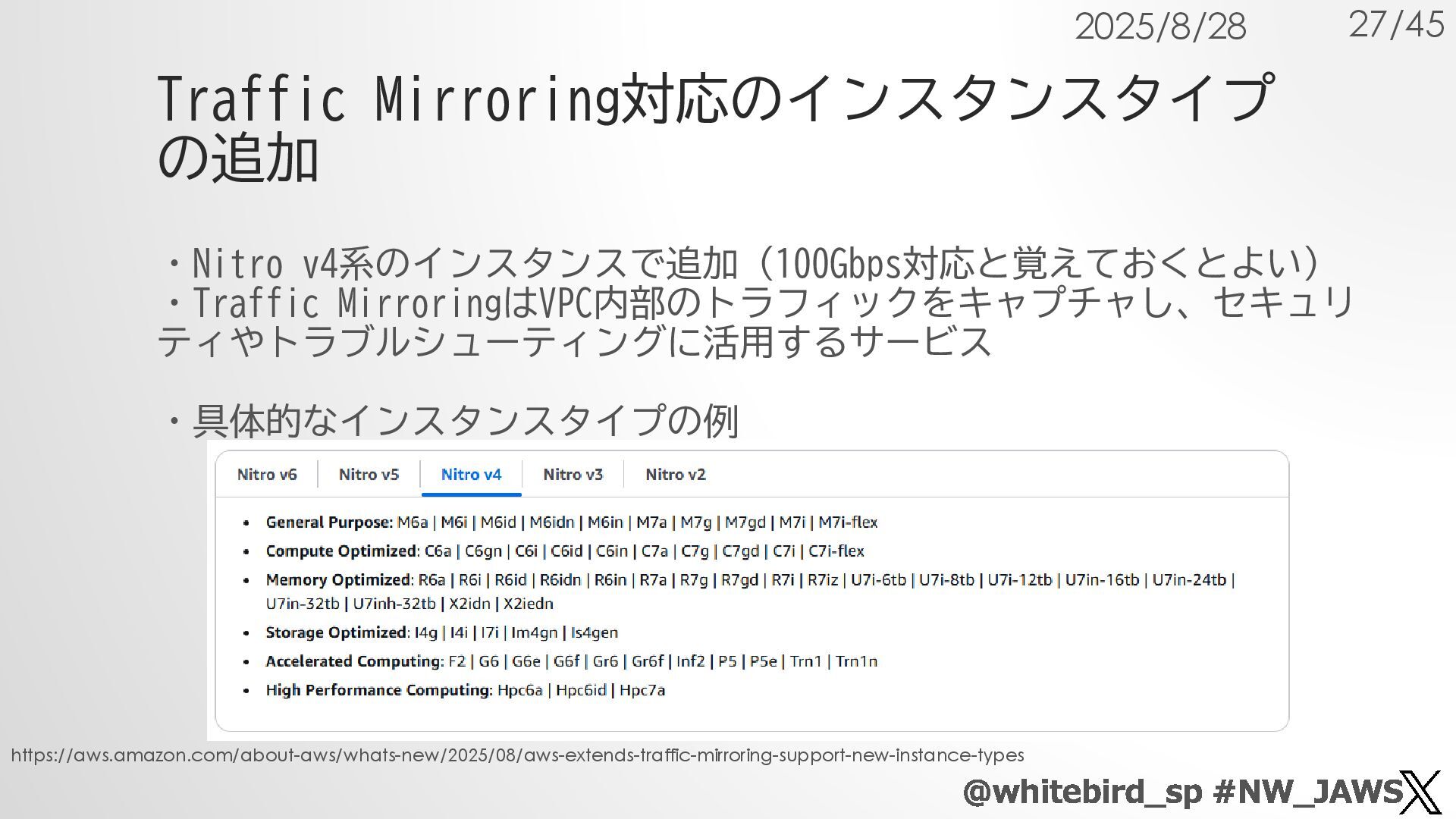 20. Traffic Mirroring対応のインスタンスタイプ の追加 @whitebird_sp #NW_JAWS 27/45 https://aws.amazon.com/about-aws/whats-new/2025/08/aws-extends-traffic-mirroring-support-new-instance-types 2025/8/28 ・Nitro v4系のインスタンスで追加(100Gbps対応と覚えておくとよい)