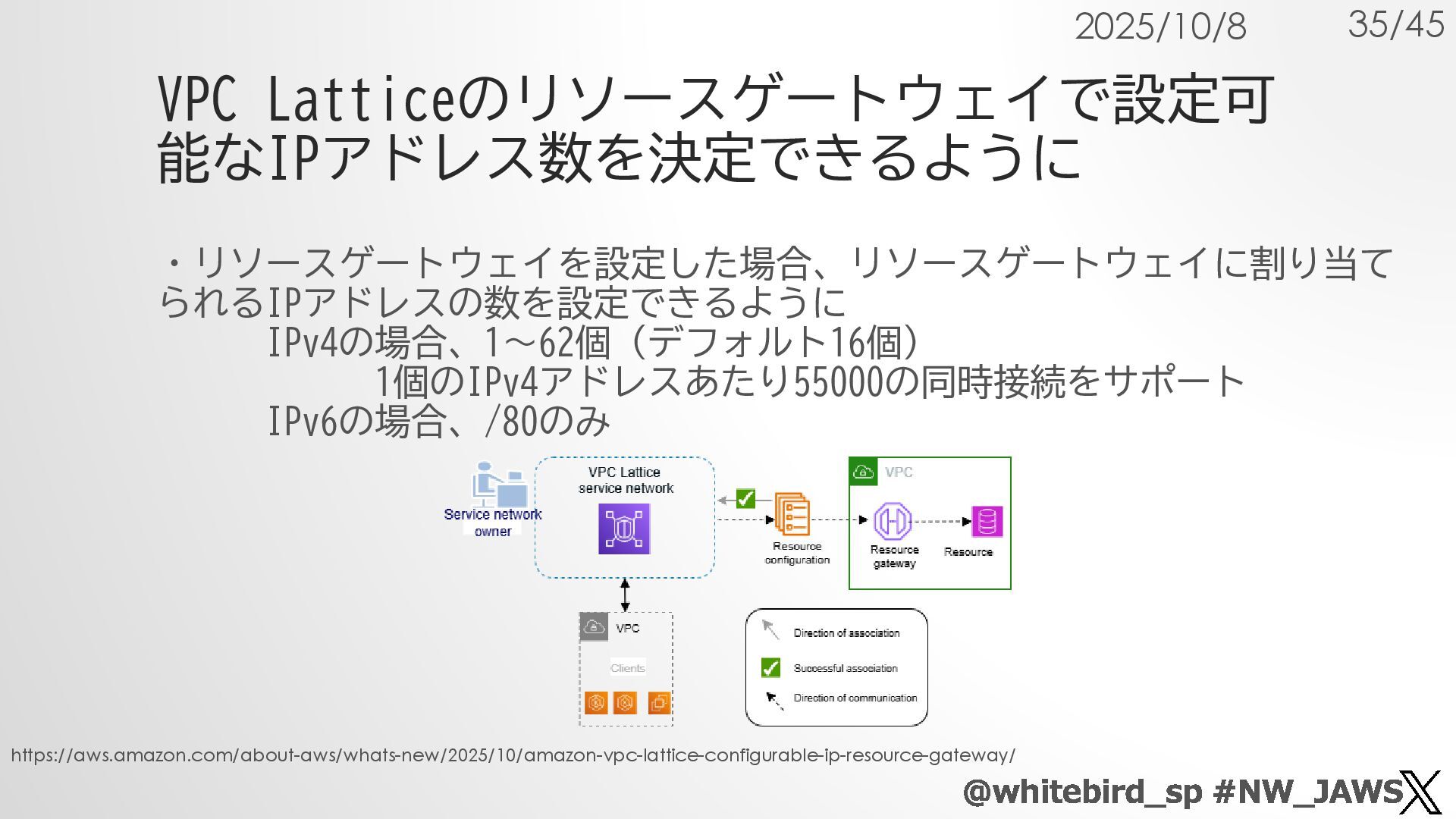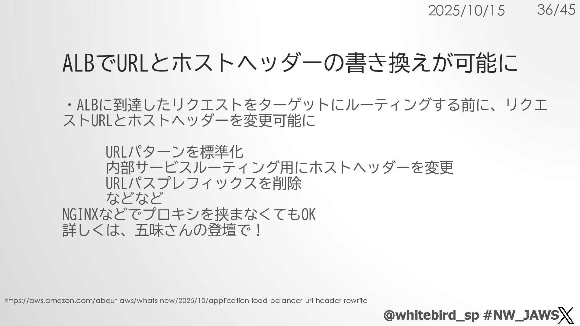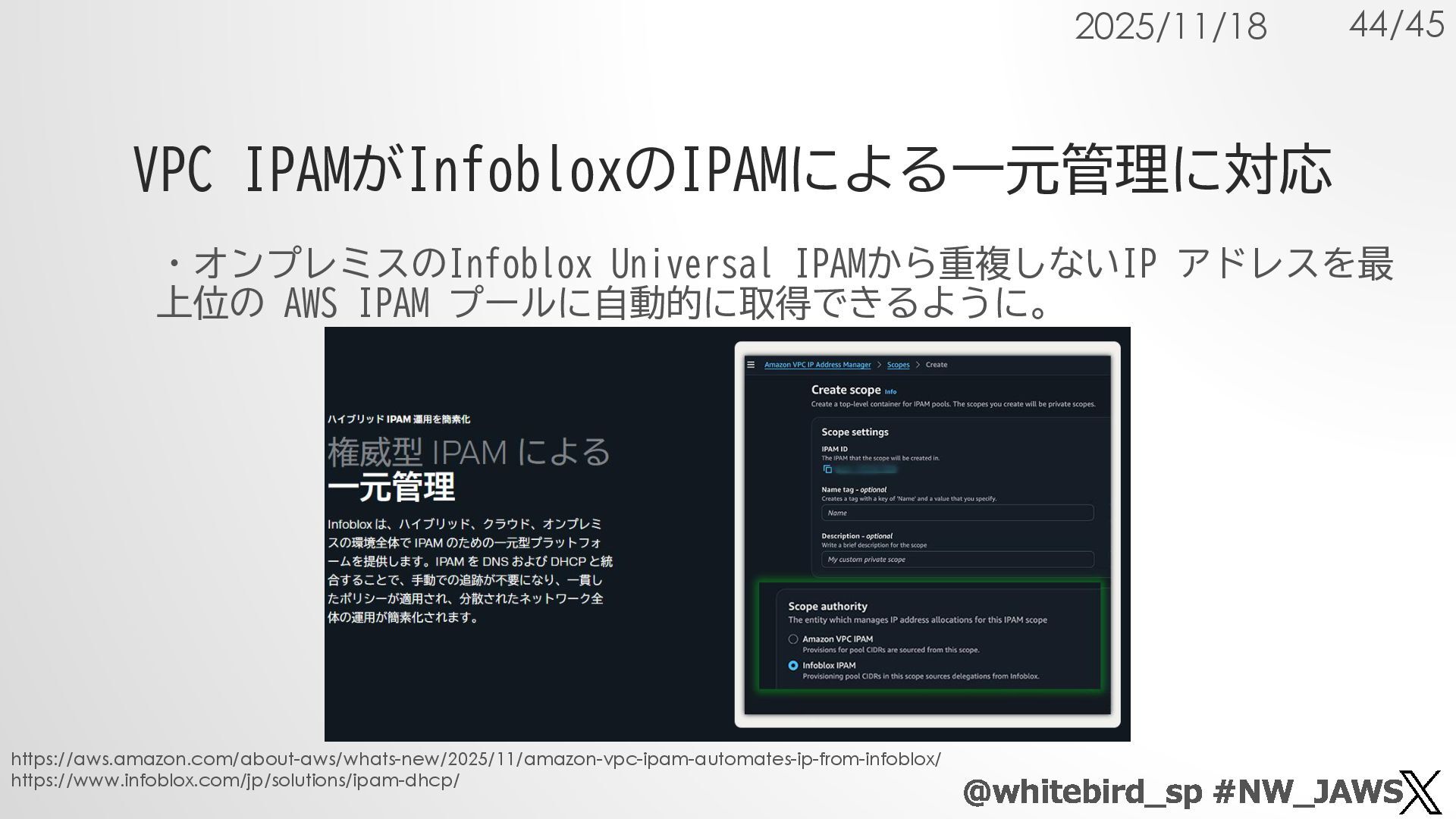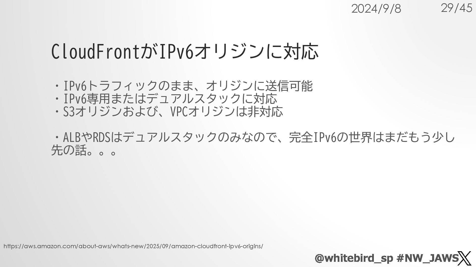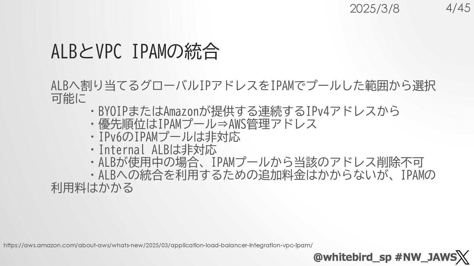 6. ALBとVPC IPAMの統合 @whitebird_sp #NW_JAWS 4/45 https://aws.amazon.com/about-aws/whats-new/2025/03/application-load-balancer-integration-vpc-ipam/ 2025/3/8 ALBへ割り当てるグローバルIPアドレスをIPAMでプールした範囲から選択 可能に ・BYOIPまたはAmazonが提供する連続するIPv4アドレスから