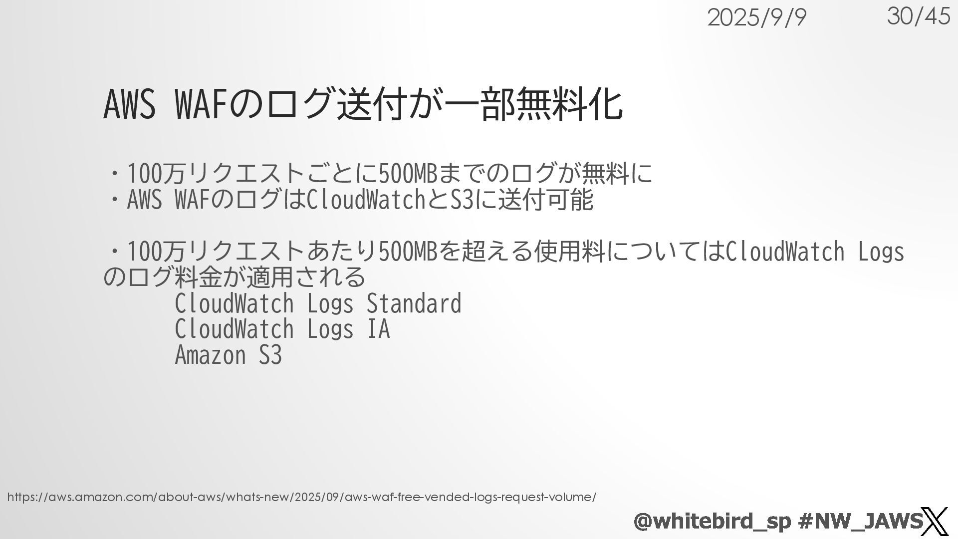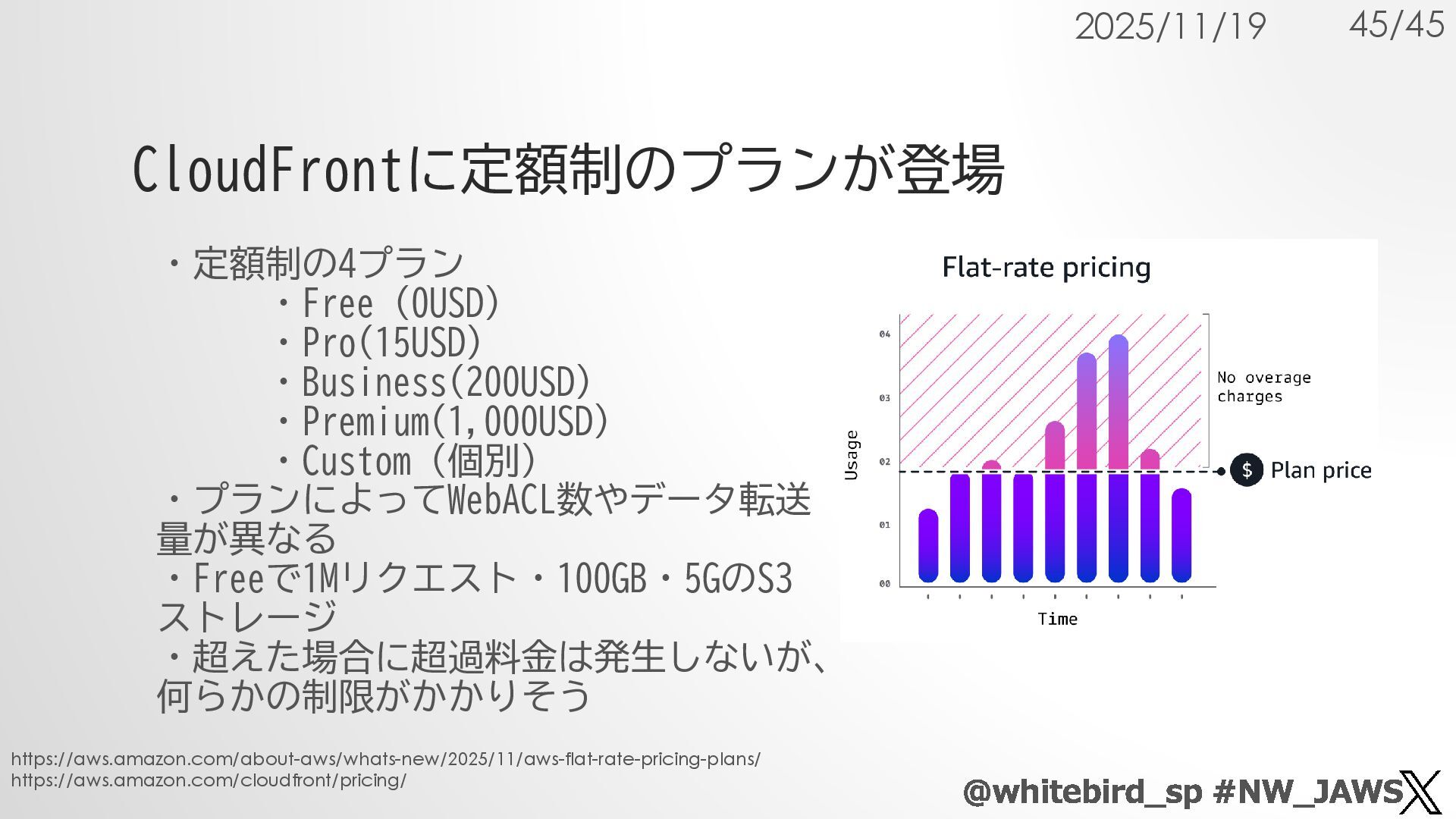 29. CloudFrontに定額制のプランが登場 @whitebird_sp #NW_JAWS 45/45 https://aws.amazon.com/about-aws/whats-new/2025/11/aws-flat-rate-pricing-plans/ https://aws.amazon.com/cloudfront/pricing/ 2025/11/19 ・定額制の4プラン ・Free(0USD) ・Pro(15USD)