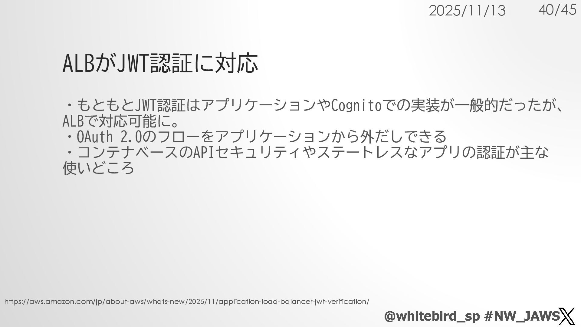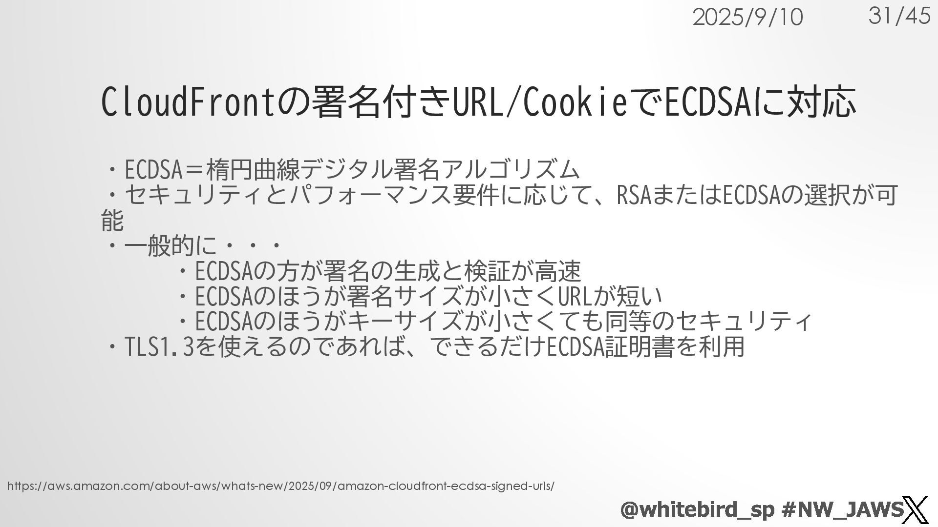 22. CloudFrontの署名付きURL/CookieでECDSAに対応 @whitebird_sp #NW_JAWS 31/45 https://aws.amazon.com/about-aws/whats-new/2025/09/amazon-cloudfront-ecdsa-signed-urls/ 2025/9/10 ・ECDSA=楕円曲線デジタル署名アルゴリズム ・セキュリティとパフォーマンス要件に応じて、RSAまたはECDSAの選択が可 能 ・一般的に・・・