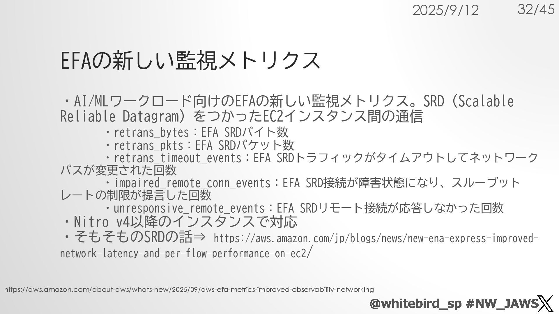 23. EFAの新しい監視メトリクス @whitebird_sp #NW_JAWS 32/45 https://aws.amazon.com/about-aws/whats-new/2025/09/aws-efa-metrics-improved-observability-networking 2025/9/12 ・AI/MLワークロード向けのEFAの新しい監視メトリクス。SRD(Scalable Reliable Datagram)をつかったEC2インスタンス間の通信 ・retrans_bytes:EFA