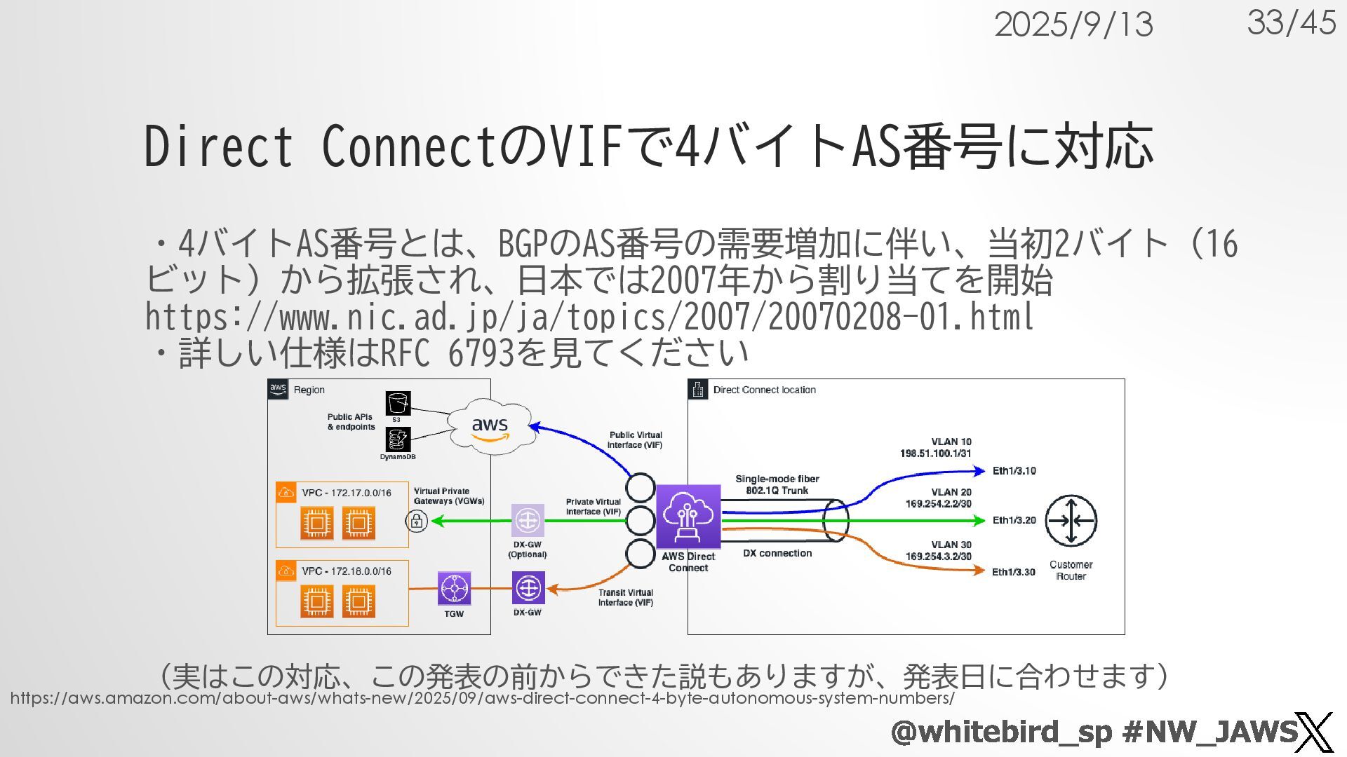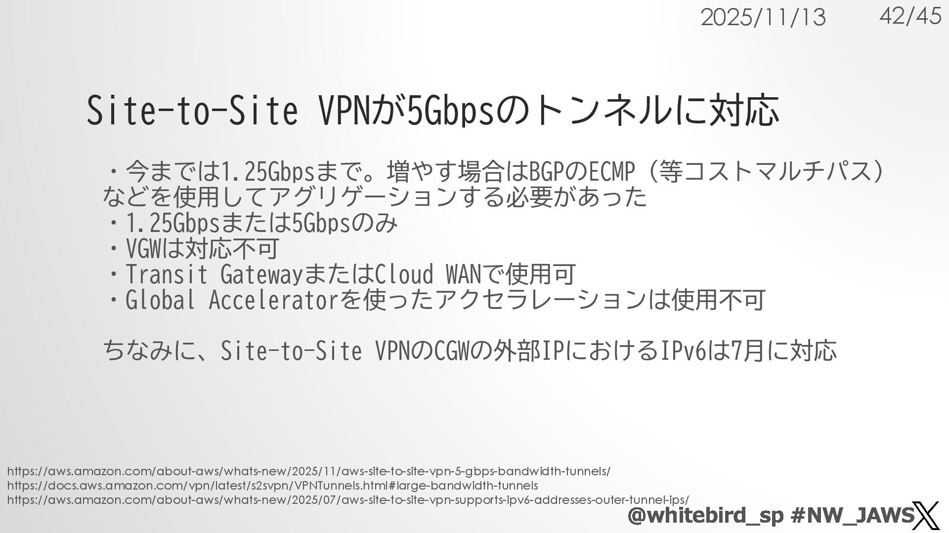 27. Site-to-Site VPNが5Gbpsのトンネルに対応 @whitebird_sp #NW_JAWS 42/45 https://aws.amazon.com/about-aws/whats-new/2025/11/aws-site-to-site-vpn-5-gbps-bandwidth-tunnels/ https://docs.aws.amazon.com/vpn/latest/s2svpn/VPNTunnels.html#large-bandwidth-tunnels https://aws.amazon.com/about-aws/whats-new/2025/07/aws-site-to-site-vpn-supports-ipv6-addresses-outer-tunnel-ips/ 2025/11/13 ・今までは1.25Gbpsまで。増やす場合はBGPのECMP(等コストマルチパス)