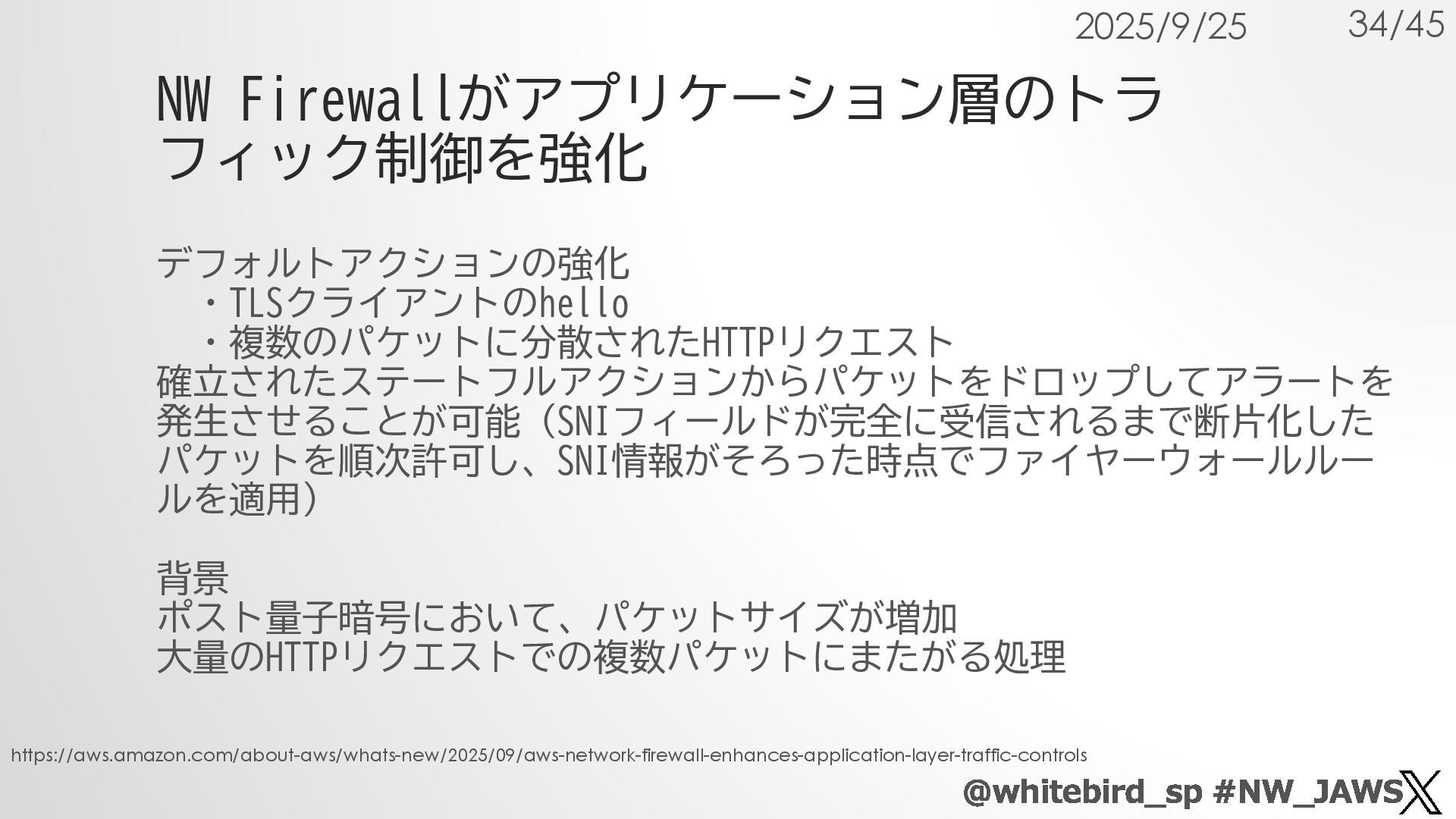 24. NW Firewallがアプリケーション層のトラ フィック制御を強化 @whitebird_sp #NW_JAWS 34/45 https://aws.amazon.com/about-aws/whats-new/2025/09/aws-network-firewall-enhances-application-layer-traffic-controls 2025/9/25 デフォルトアクションの強化 ・TLSクライアントのhello