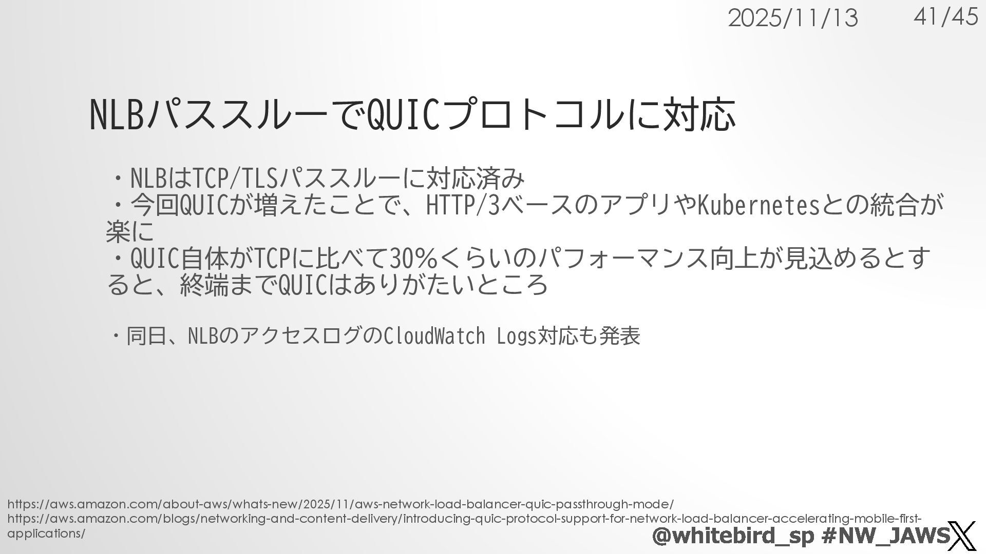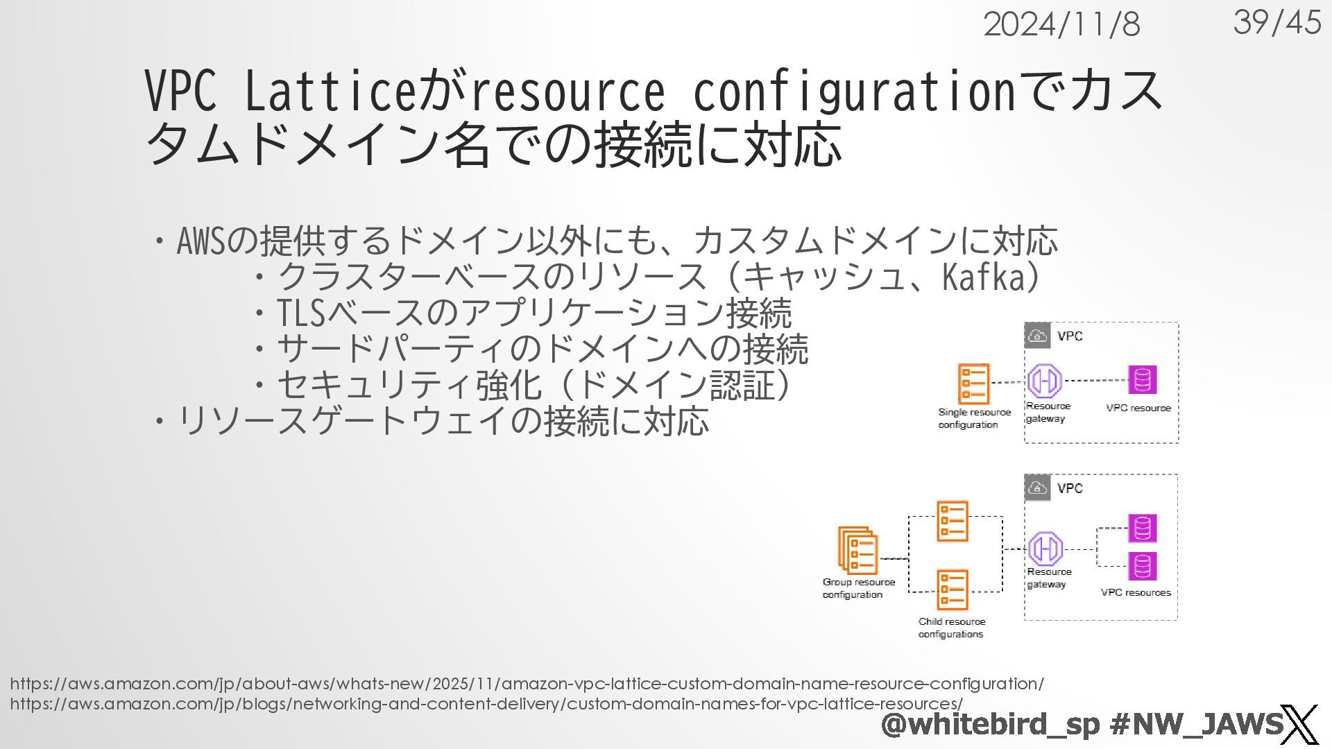 26. VPC Latticeがresource configurationでカス タムドメイン名での接続に対応 @whitebird_sp #NW_JAWS 39/45 https://aws.amazon.com/jp/about-aws/whats-new/2025/11/amazon-vpc-lattice-custom-domain-name-resource-configuration/ https://aws.amazon.com/jp/blogs/networking-and-content-delivery/custom-domain-names-for-vpc-lattice-resources/ 2024/11/8