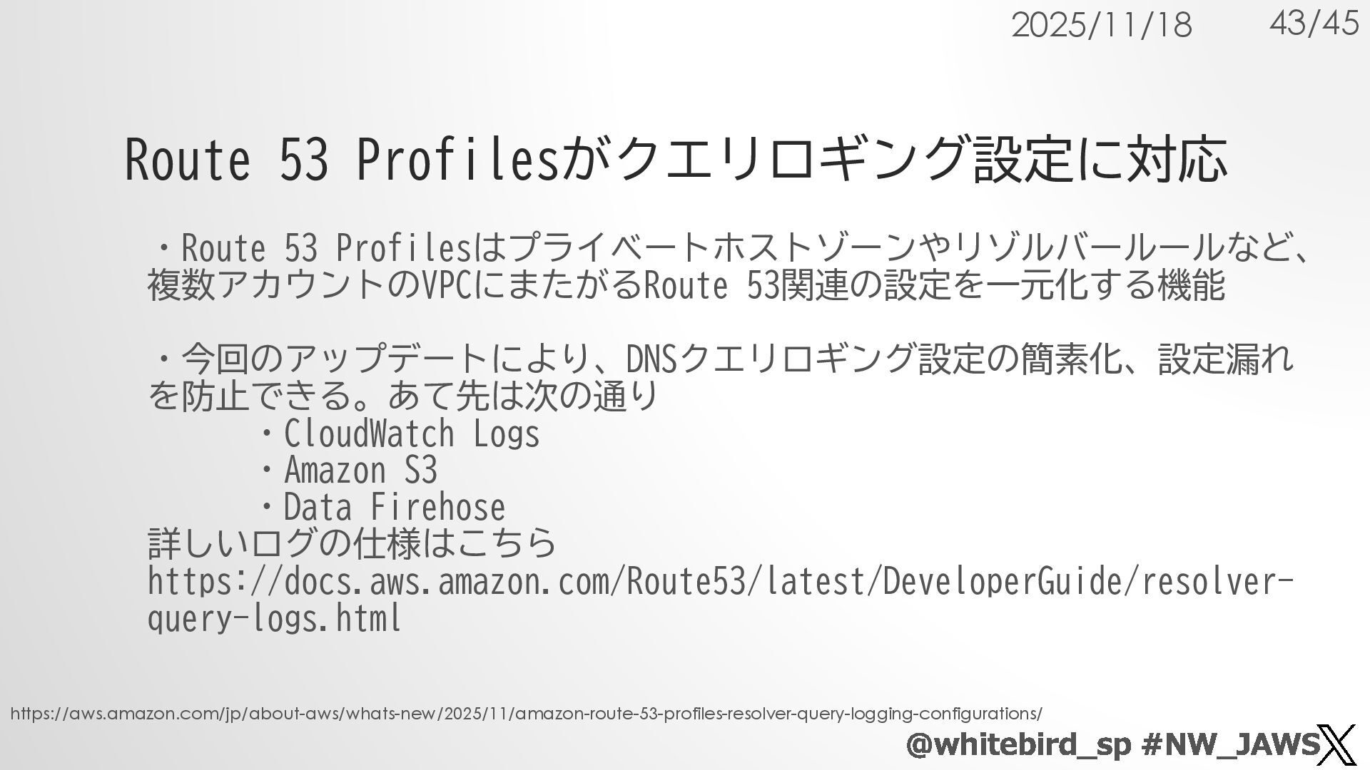 28. Route 53 Profilesがクエリロギング設定に対応 @whitebird_sp #NW_JAWS 43/45 https://aws.amazon.com/jp/about-aws/whats-new/2025/11/amazon-route-53-profiles-resolver-query-logging-configurations/ 2025/11/18 ・Route 53