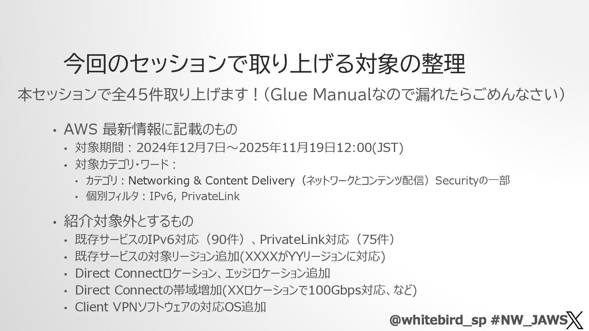 • カテゴリ:Networking & Content Delivery(ネットワークとコンテンツ配信)Securityの一部 • 個別フィルタ:IPv6, PrivateLink • 紹介対象外とするもの • 既存サービスのIPv6対応(90件)、PrivateLink対応(75件) • 既存サービスの対象リージョン追加(XXXXがYYリージョンに対応) • Direct Connectロケーション、エッジロケーション追加 • Direct Connectの帯域増加(XXロケーションで100Gbps対応、など) • Client VPNソフトウェアの対応OS追加 本セッションで全45件取り上げます!(Glue Manualなので漏れたらごめんなさい)