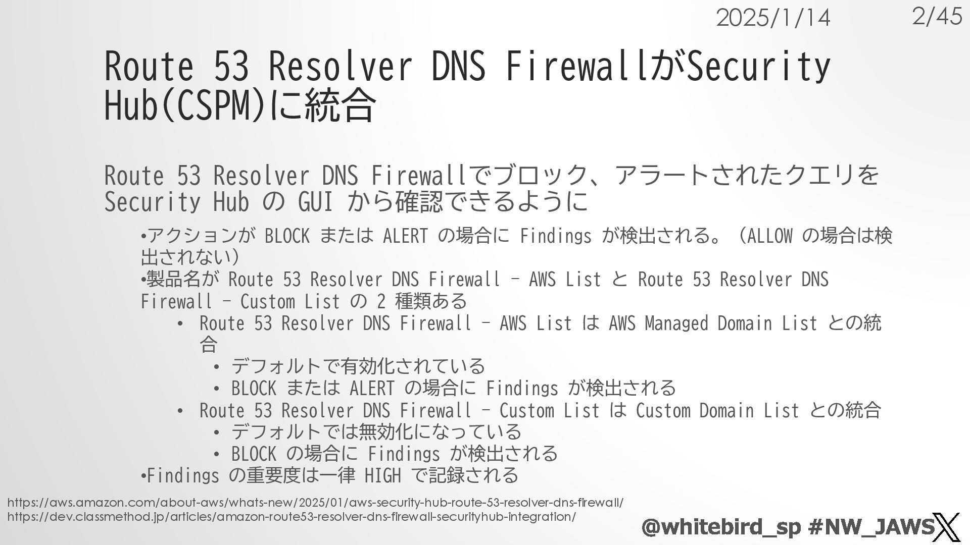 4. @whitebird_sp #NW_JAWS 2/45 https://aws.amazon.com/about-aws/whats-new/2025/01/aws-security-hub-route-53-resolver-dns-firewall/ https://dev.classmethod.jp/articles/amazon-route53-resolver-dns-firewall-securityhub-integration/ 2025/1/14 Route 53 Resolver DNS