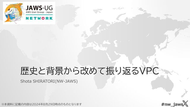 •Limited Beta Dec •Unlimited Beta 2010 Feb •EBS Support Sep •マネージメントコンソー ル(MC) 2011 Mar •IGW, EIP, NATinstance, NACL, SG Aug •Multi-AZ Sep •DirectConnect(DX )&東京リージョンで VPC対応 2012 Jun •Multiple IP Jul •Internal ELB 2013 Oct •DXのMulti- Connect Dec •Default VPC 2014 Mar •VPC peering Sep •Route 53 Private host zone 2015 Jun •VPC flow logs Dec •NAT gateway 2016 Jul •DNS for VPC peering Aug •RDS in your VPC Dec •IPv6 2017 Aug •Add CIDRs Nov •PrivateLink •Inter-Region VPC Peering 2018 Oct •BYOIP Nov •Agentless network assessments •Transit Gateway Dec •VPC Sharing •ClientVPN 2019 Jul •VPC Traffic Mirroring Dec •Local Zones •VPC Ingress Routing 2020 May •BYOIPv6 Nov •Network Firewall Dec •Reachability Analyzer 2021 Jul •Private NAT Gateway Nov •DNS64/NAT64 Dec •Network Access Analyzer •IPAM •Cloud WAN 2022 Mar •Multiple CIDRs on IPv6 Nov •VPC Lattice 2023 Nov •Multi-VPC ENI 2024 May •Route 53 Profiles 企業の独立した内部ネットワーク 環境で必要な機能の拡張 外部ネットワークとの接続に必要 な機能の拡張 大規模対応(マルチアカウント・マ ルチリージョン・ハイブリッド)