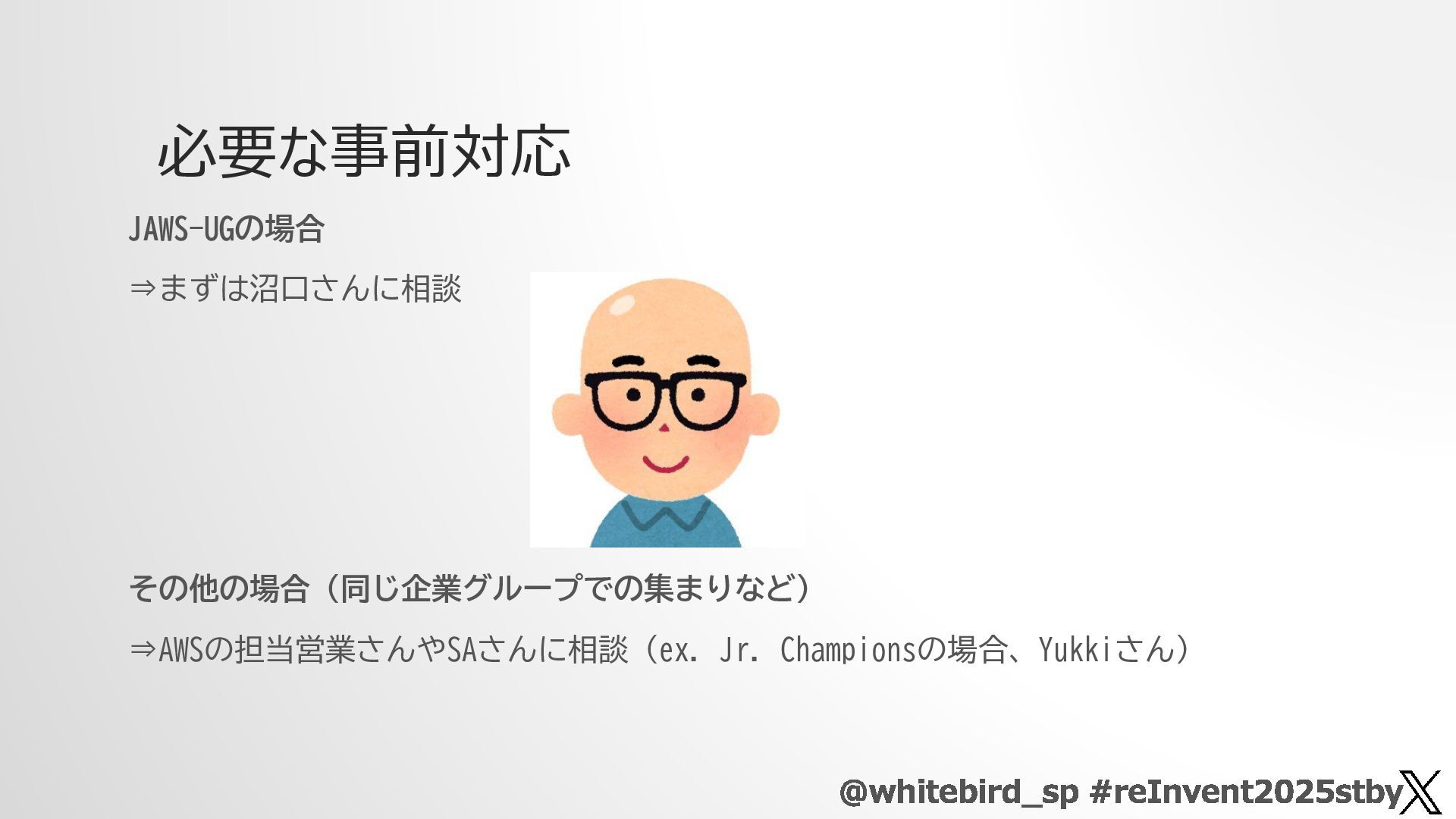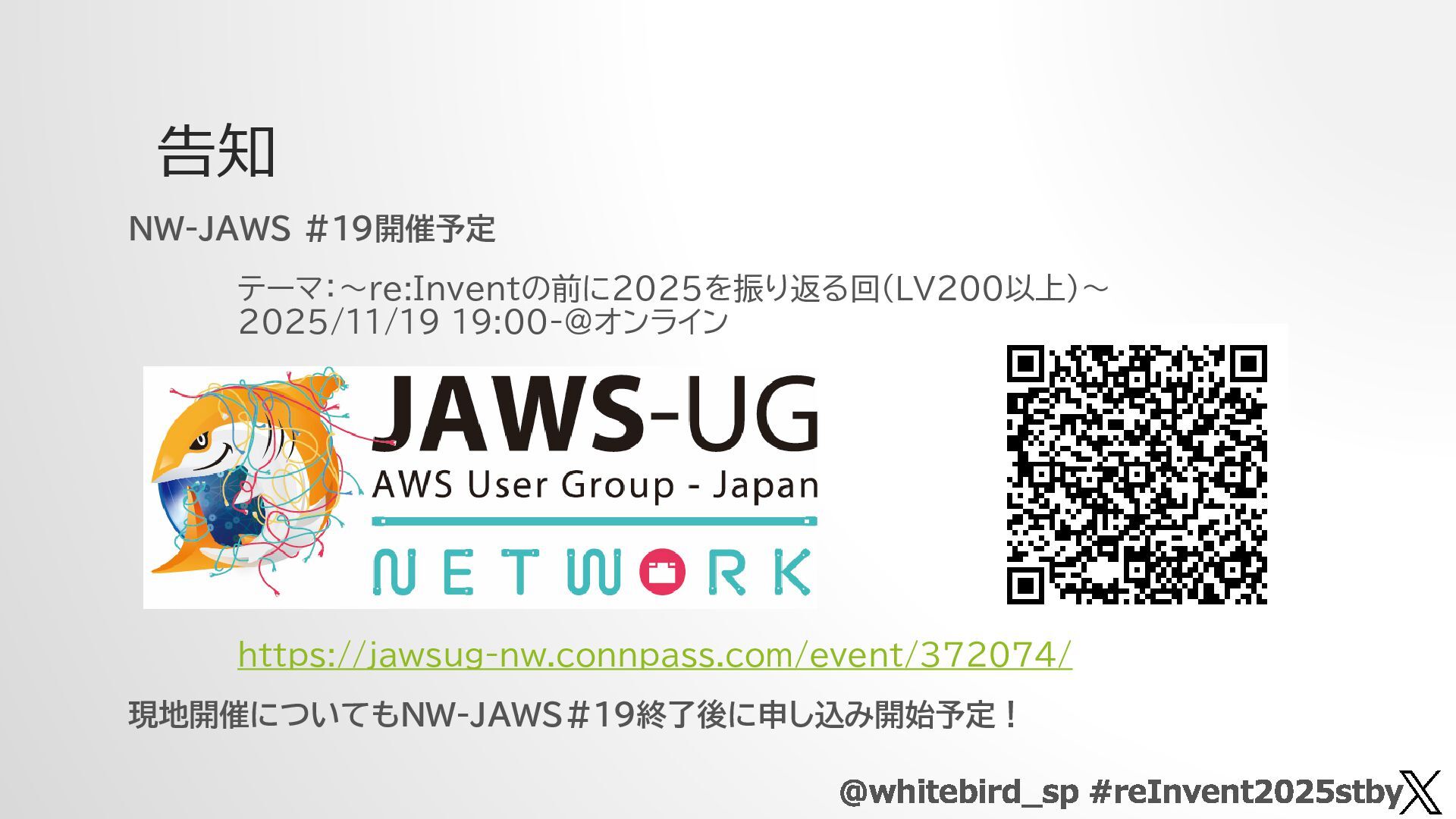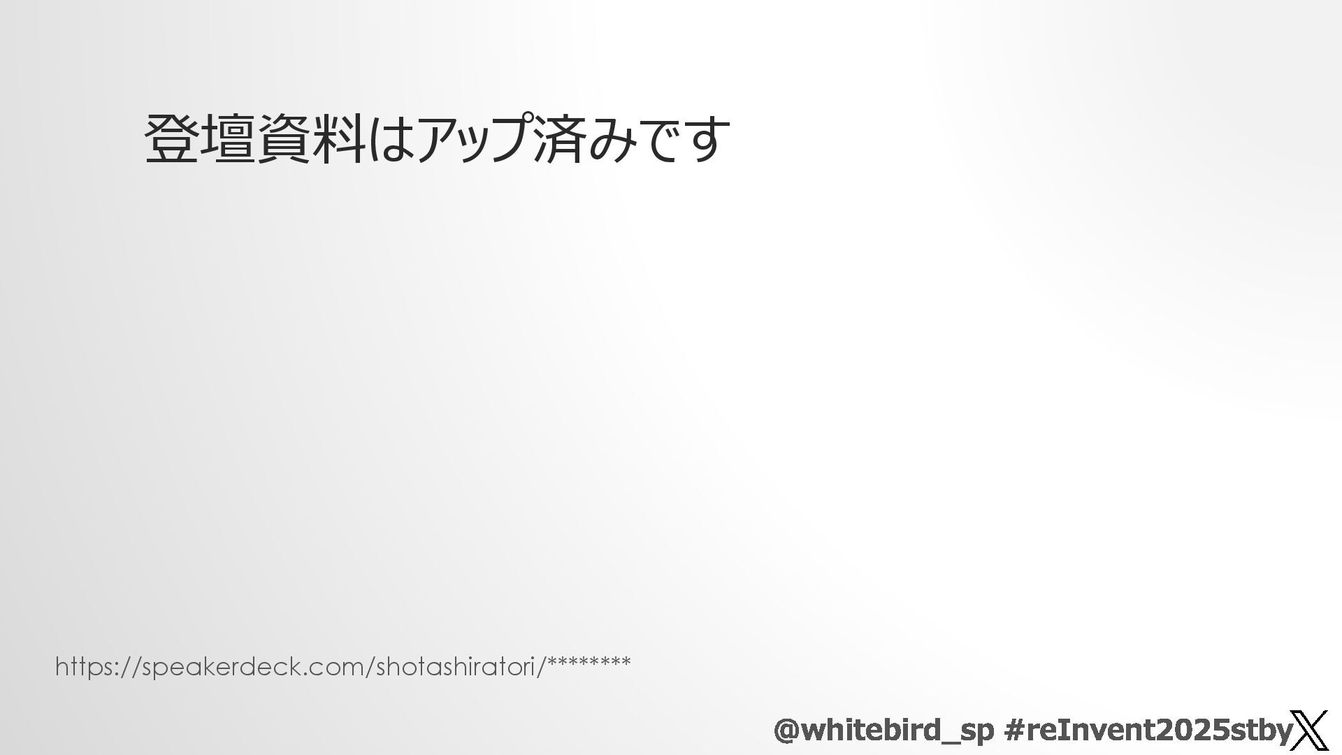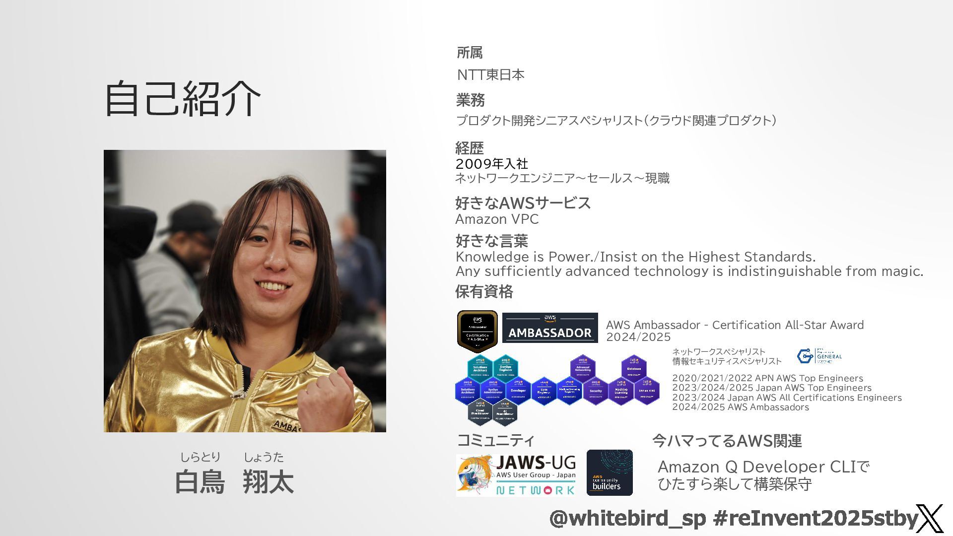 保有資格 しらとり しょうた 好きなAWSサービス Amazon VPC ネットワークスペシャリスト 情報セキュリティスペシャリスト 2020/2021/2022 APN AWS Top Engineers 2023/2024/2025 Japan AWS Top Engineers 2023/2024 Japan AWS All Certifications Engineers 2024/2025 AWS Ambassadors 好きな言葉 Knowledge is Power./Insist on the Highest Standards. Any sufficiently advanced technology is indistinguishable from magic. コミュニティ AWS Ambassador - Certification All-Star Award 2024/2025 今ハマってるAWS関連 Amazon Q Developer CLIで ひたすら楽して構築保守 @whitebird_sp #reInvent2025stby
