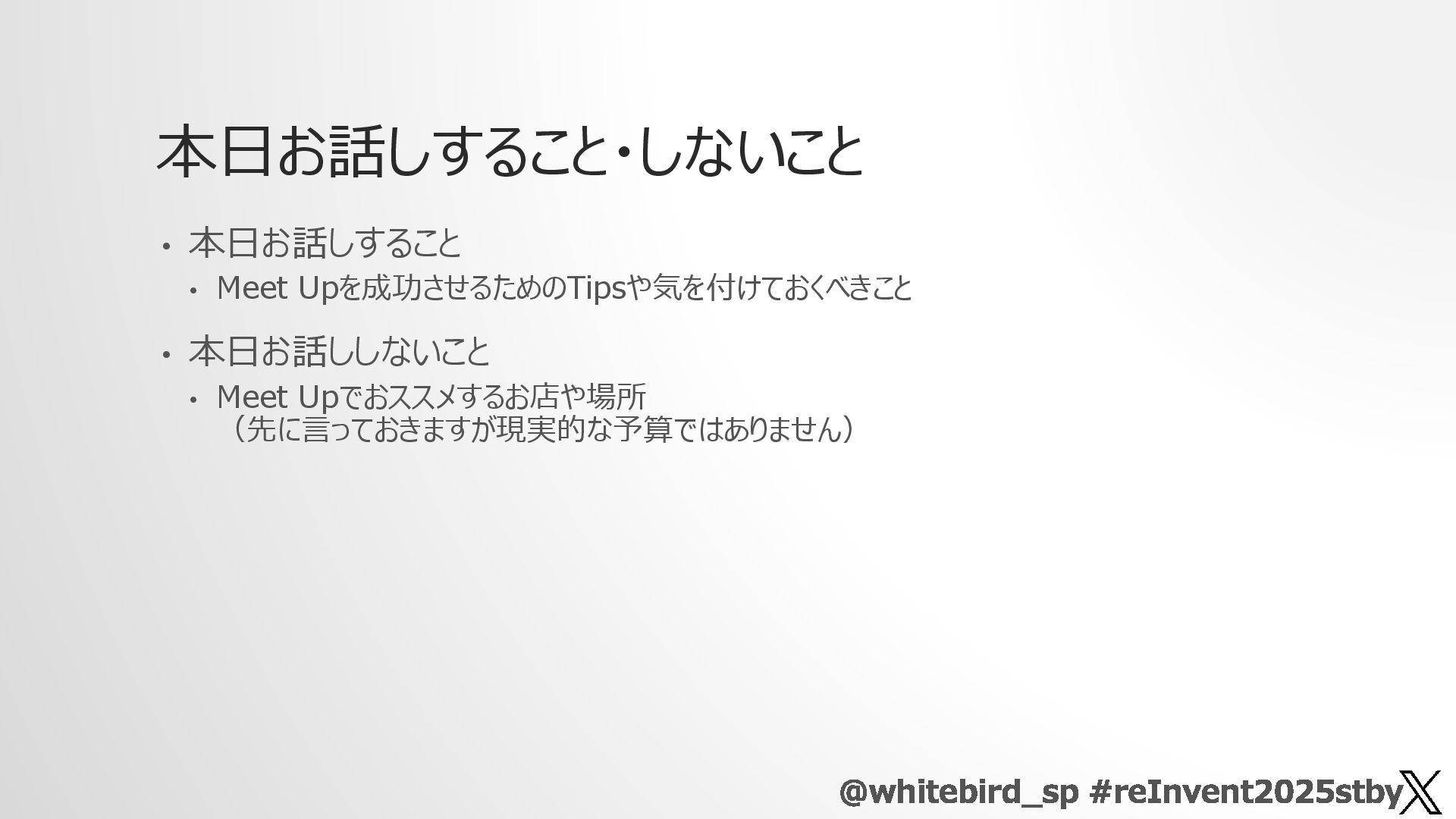 2. 本日お話しすること・しないこと • 本日お話しすること • Meet Upを成功させるためのTipsや気を付けておくべきこと • 本日お話ししないこと • Meet