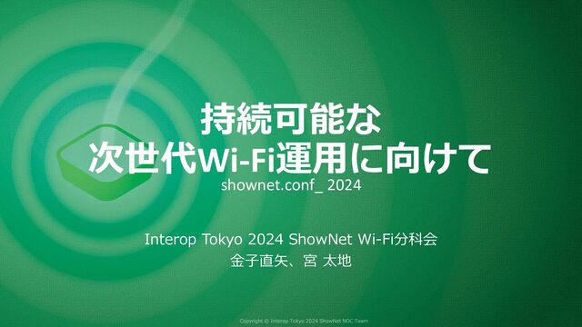 持続可能な 次世代Wi-Fi運用に向けて Interop Tokyo 2024 ShowNet Wi-Fi分科会 金子直矢、宮 太地 shownet.conf_