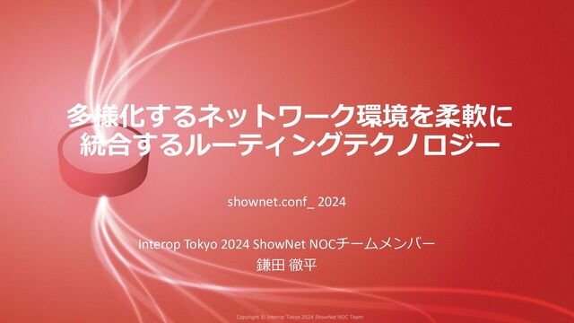 多様化するネットワーク環境を柔軟に 統合するルーティングテクノロジー shownet.conf_ 2024 Interop Tokyo 2024 ShowNet NOCチームメンバー 鎌田