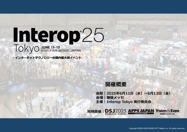 reserved. 会期|2025年6月11日(水)~6月13日(金) 会場|幕張メッセ 主催|Interop Tokyo 実行委員会 開催概要 同時開催| - インターネットテクノロジーの国内最大級イベント