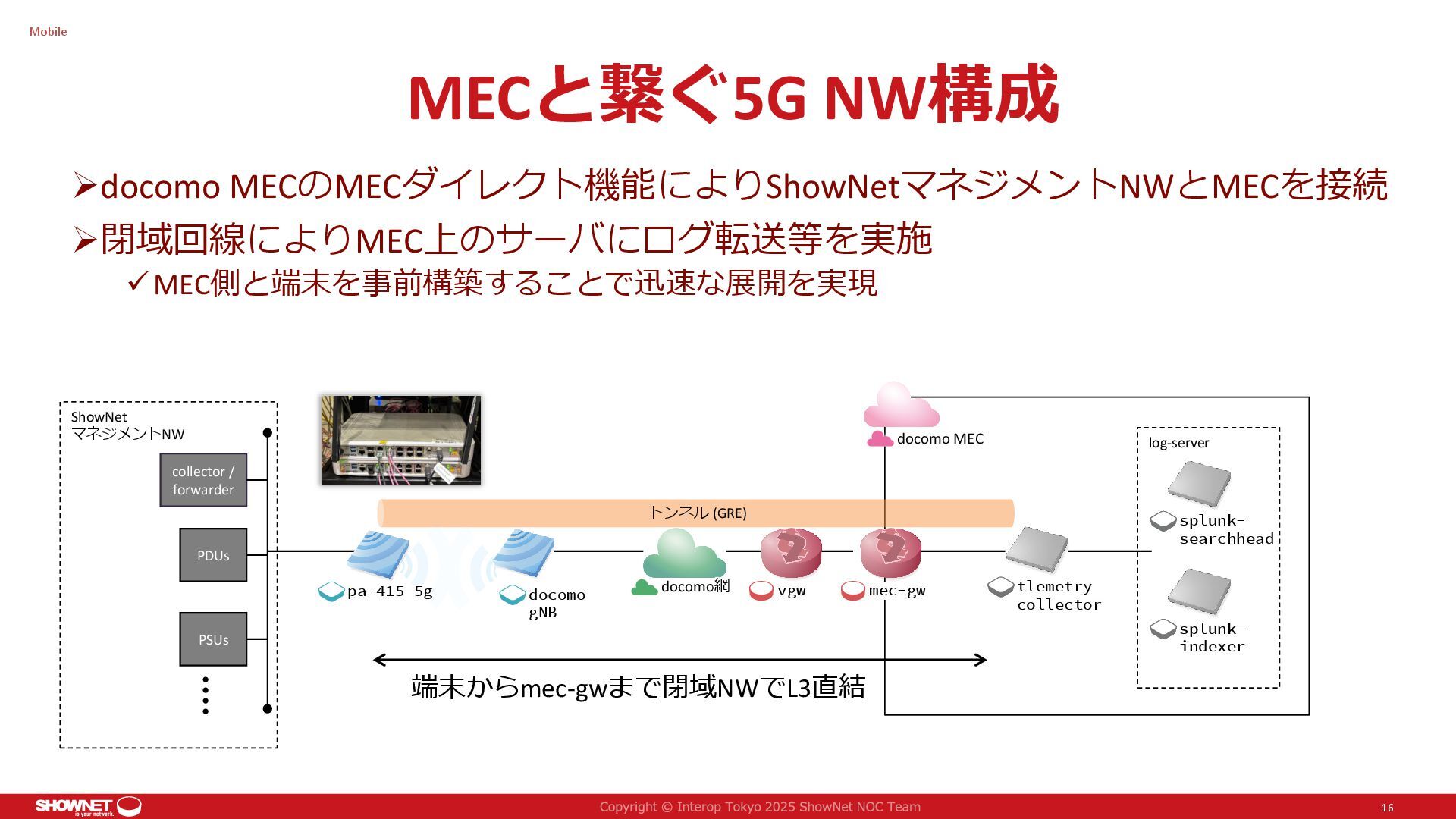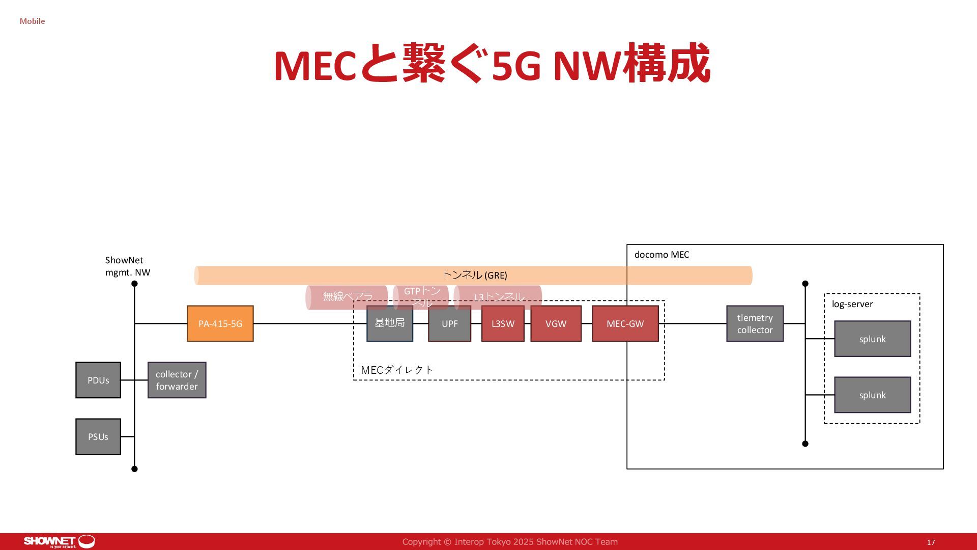 forwarder PDUs PSUs log-server pa-415-5g docomo gNB docomo網 docomo MEC mec-gw tlemetry collector splunk- searchhead splunk- indexer ShowNet マネジメントNW 端末からmec-gwまで閉域NWでL3直結 トンネル (GRE) vgw