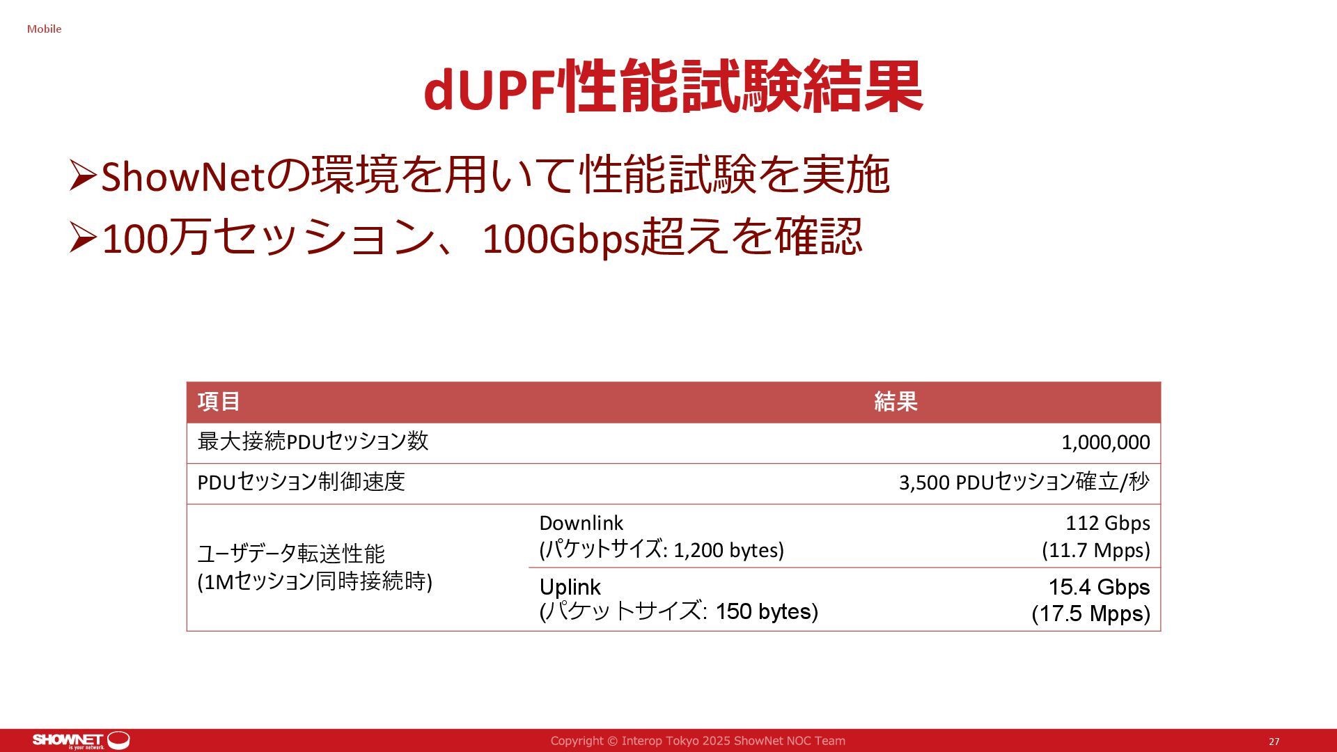11. dUPF性能試験結果 ➢ShowNetの環境を用いて性能試験を実施 ➢100万セッション、100Gbps超えを確認 Mobile 27 項目 結果 最大接続PDUセッション数 1,000,000 PDUセッション制御速度
