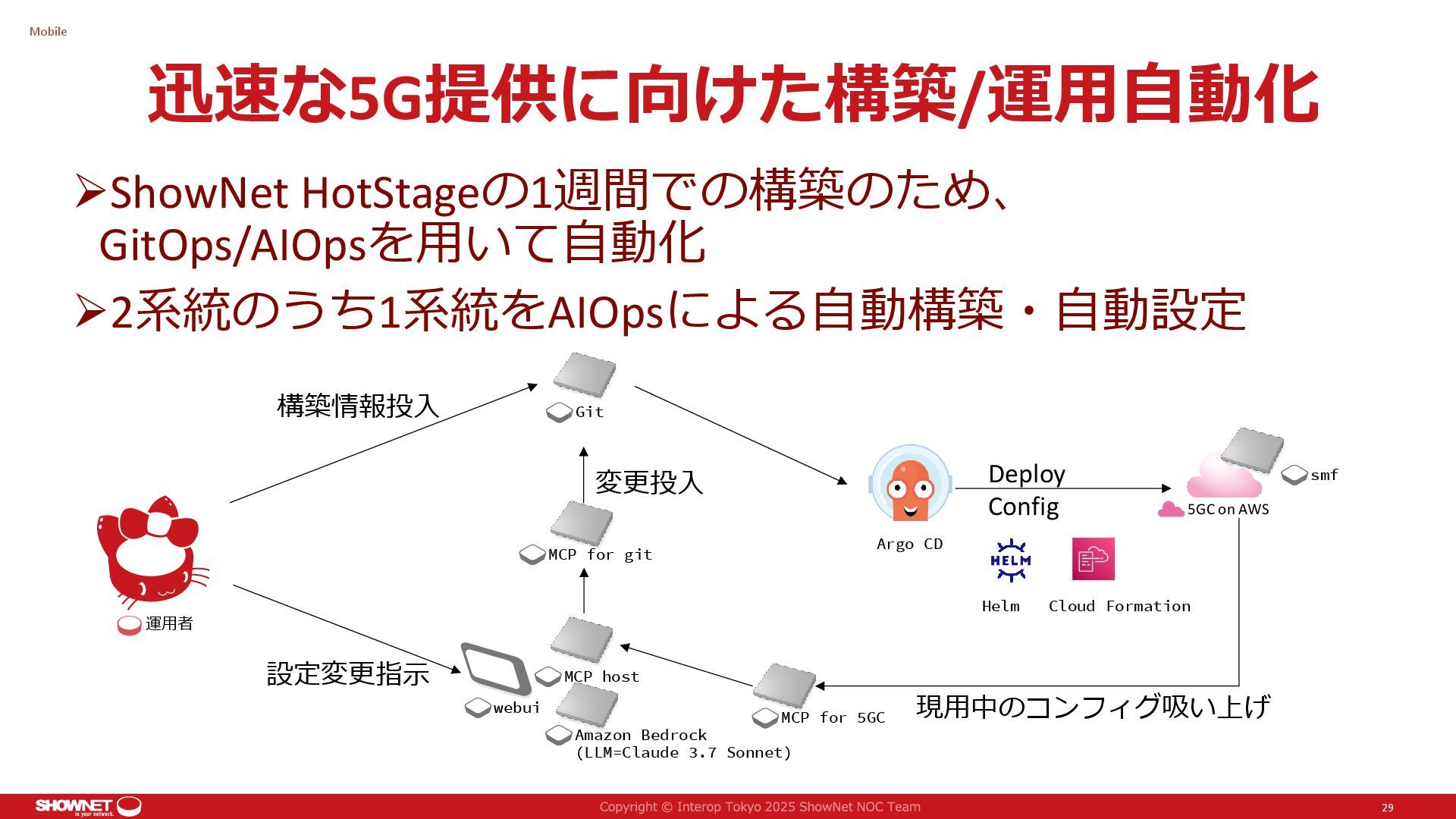 12. 迅速な5G提供に向けた構築/運用自動化 ➢ShowNet HotStageの1週間での構築のため、 GitOps/AIOpsを用いて自動化 ➢2系統のうち1系統をAIOpsによる自動構築・自動設定 Mobile 29 Git Amazon Bedrock