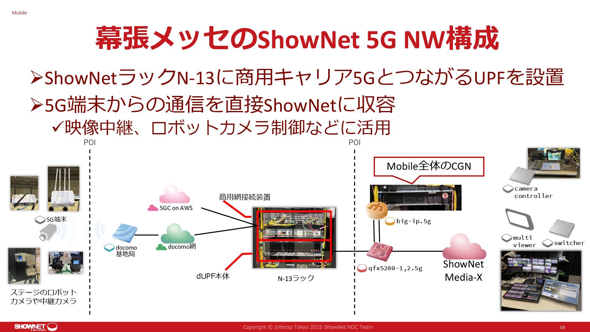 docomo 基地局 5G端末 docomo網 ShowNet Media-X POI POI qfx5200-1,2.5g multi viewer switcher N-13ラック 5GC on AWS big-ip.5g ステージのロボット カメラや中継カメラ camera controller Mobile全体のCGN