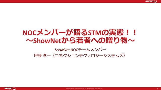 NOCメンバーが語るSTMの実態!! ~ShowNetから若者への贈り物~ ShowNet NOCチームメンバー 伊藤 孝一(コネクションテクノロジーシステムズ) 1