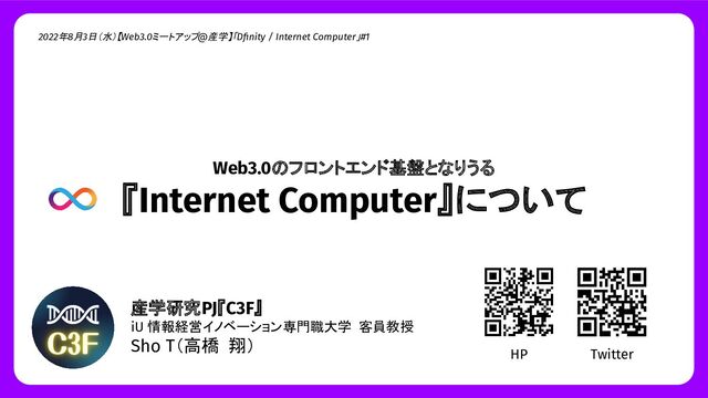 2022年8月3日(水)に開催した「【Web3.0ミートアップ@産学】「Dfinity / Internet Computer」#1 〜今後加速する「Web3.0 × スタートアップ」に向けた共創環境づくり〜」についての資料です。