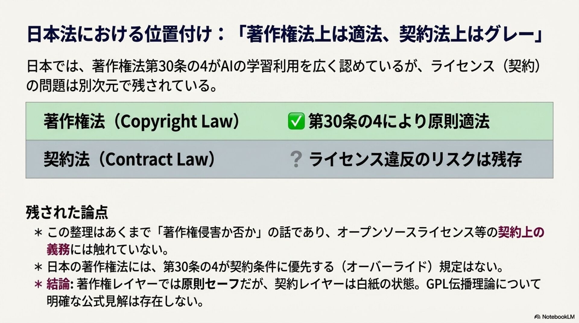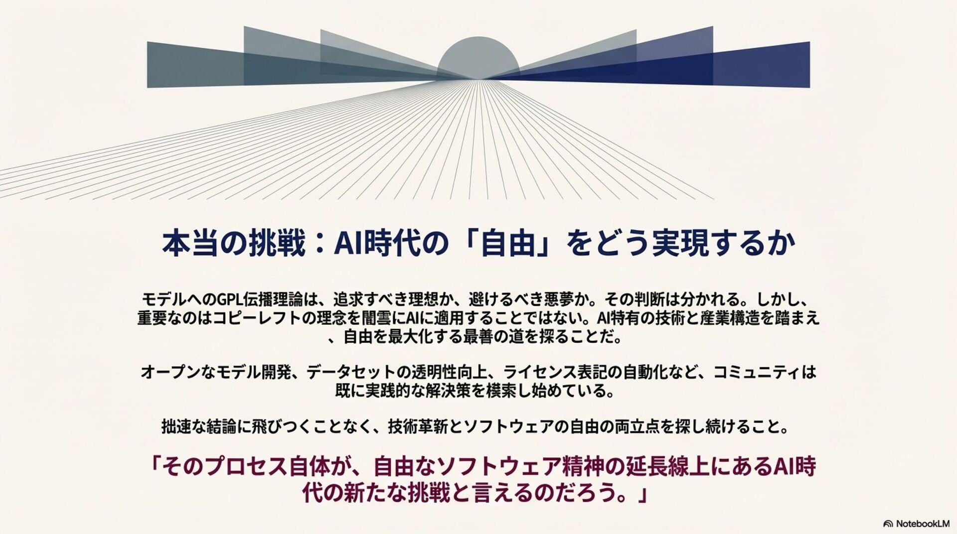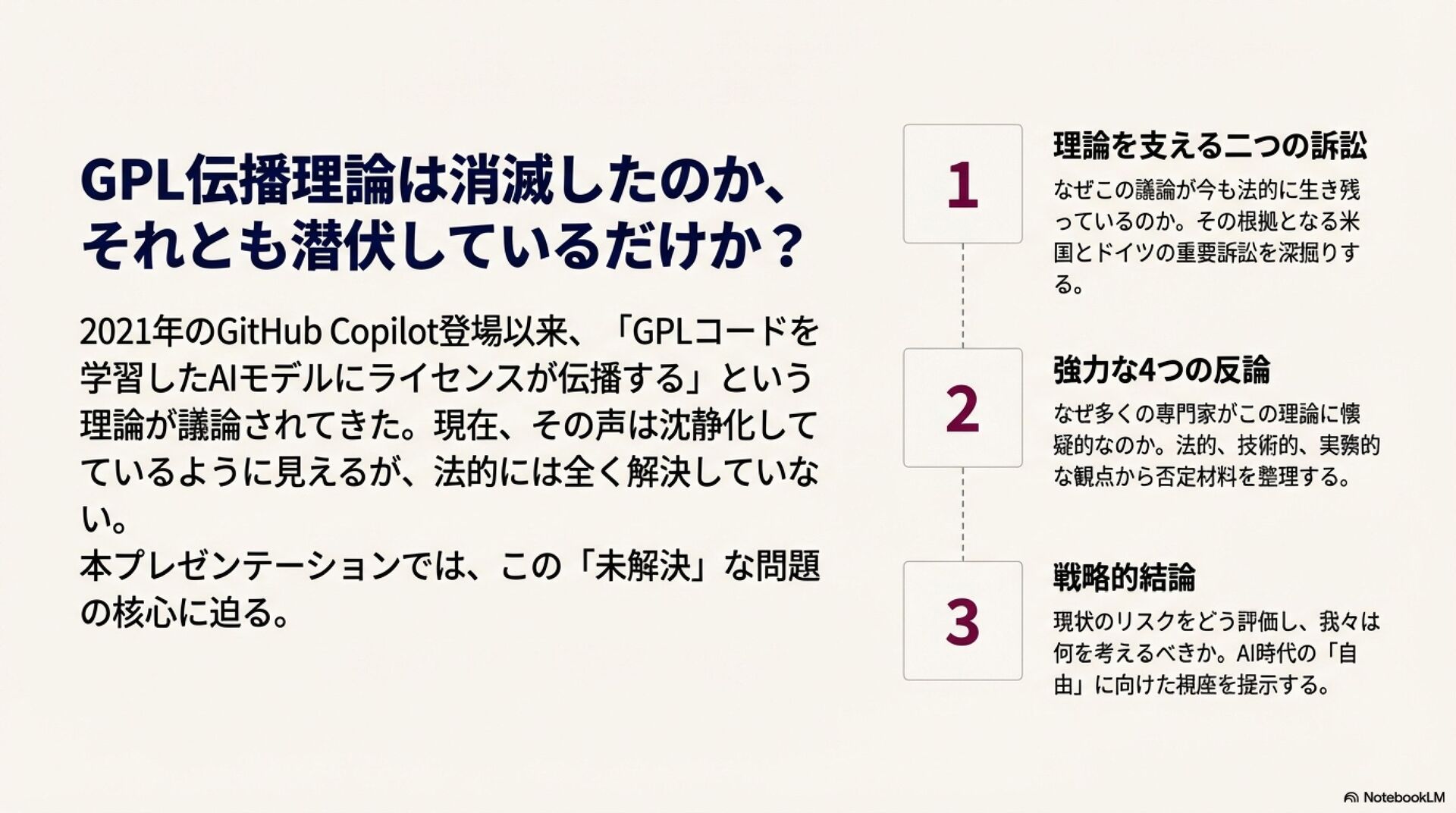 https://shujisado.com/2025/11/25/gpl_propagation_to_ai_models/ で書いた「GPLコードを学習したAIモデルにGPLが伝播するという理論の現在地」という記事を単独のソースとしてNotebookLMでスライドボタン一発で出力したそのもの。