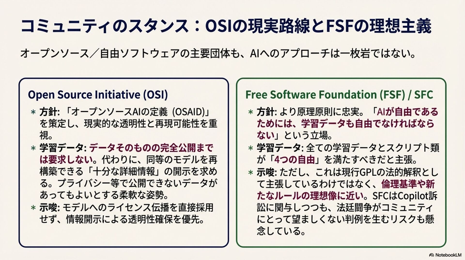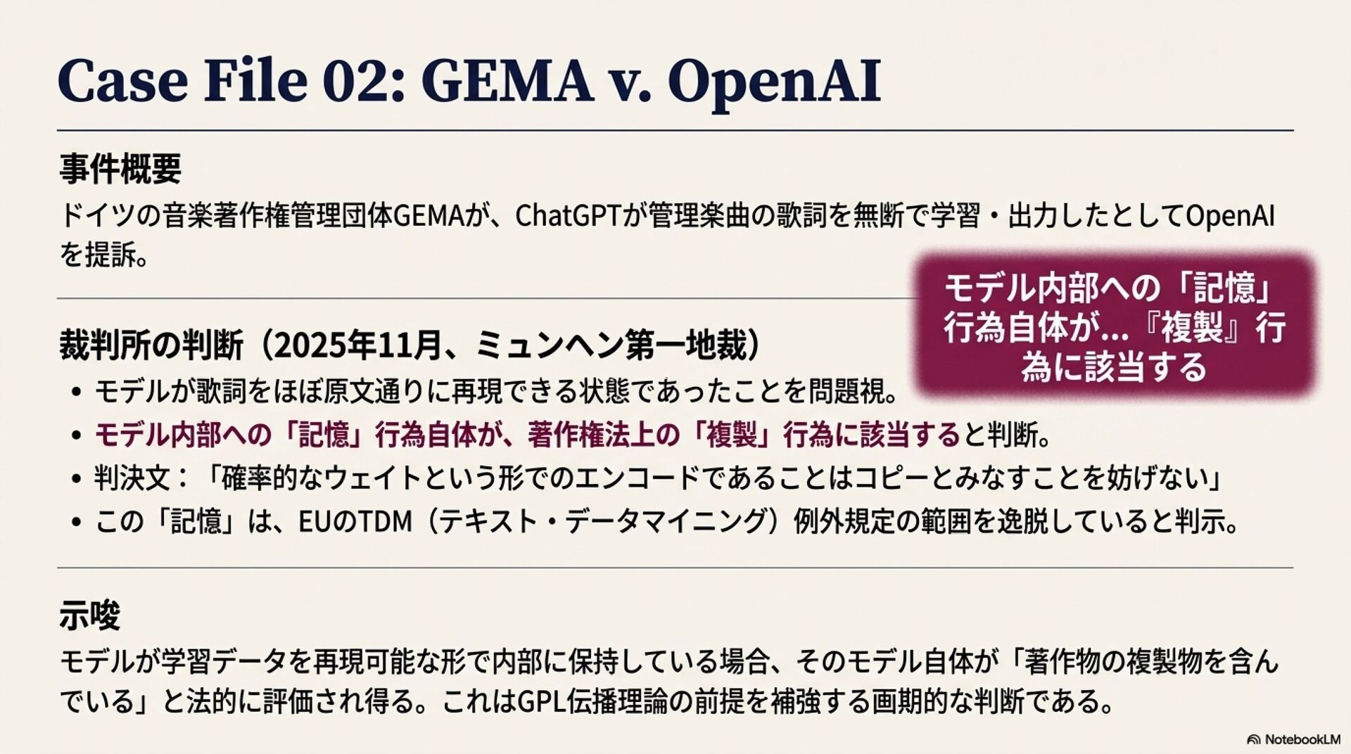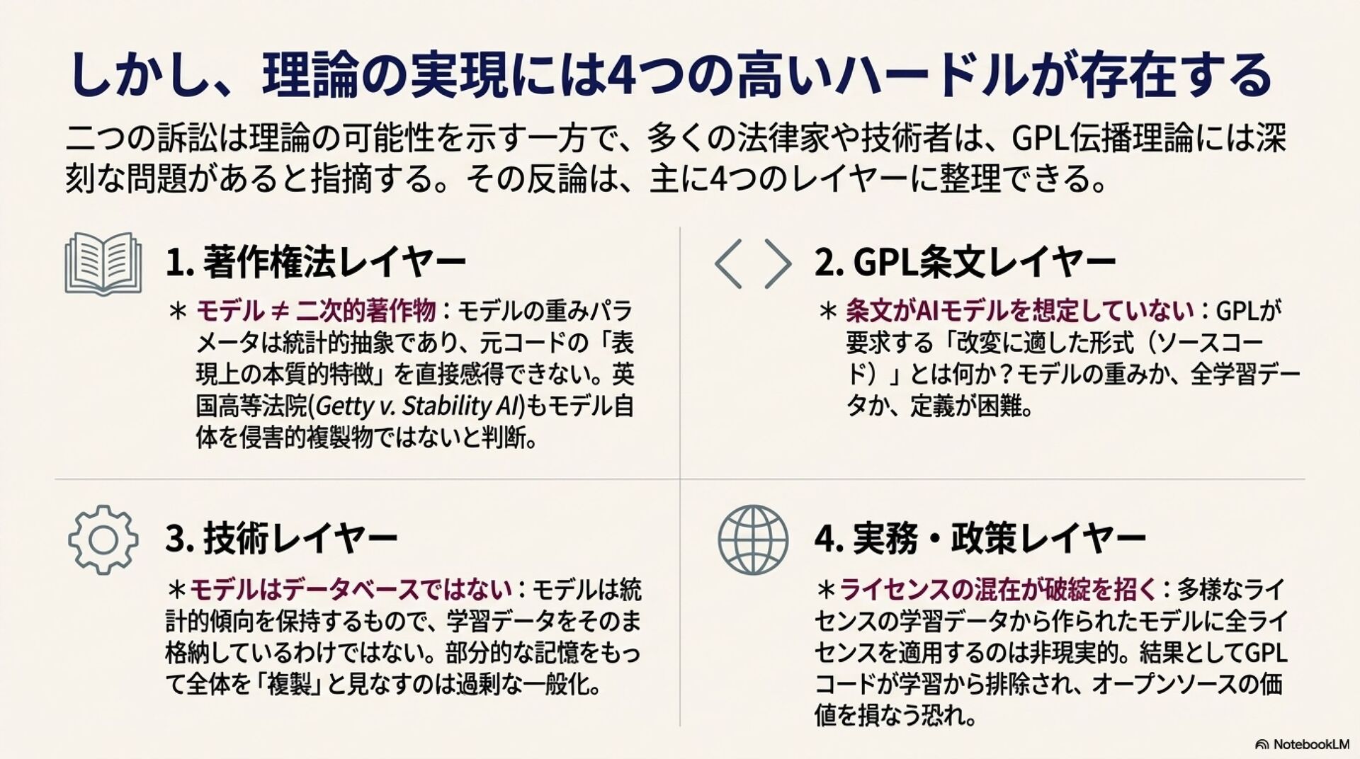 https://shujisado.com/2025/11/25/gpl_propagation_to_ai_models/ で書いた「GPLコードを学習したAIモデルにGPLが伝播するという理論の現在地」という記事を単独のソースとしてNotebookLMでスライドボタン一発で出力したそのもの。