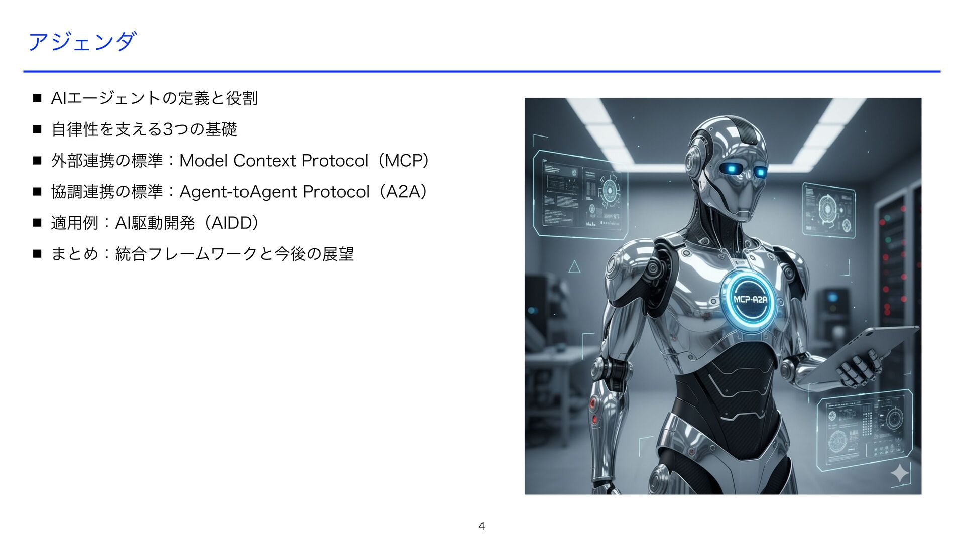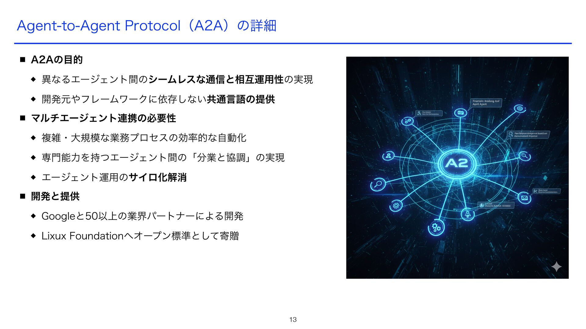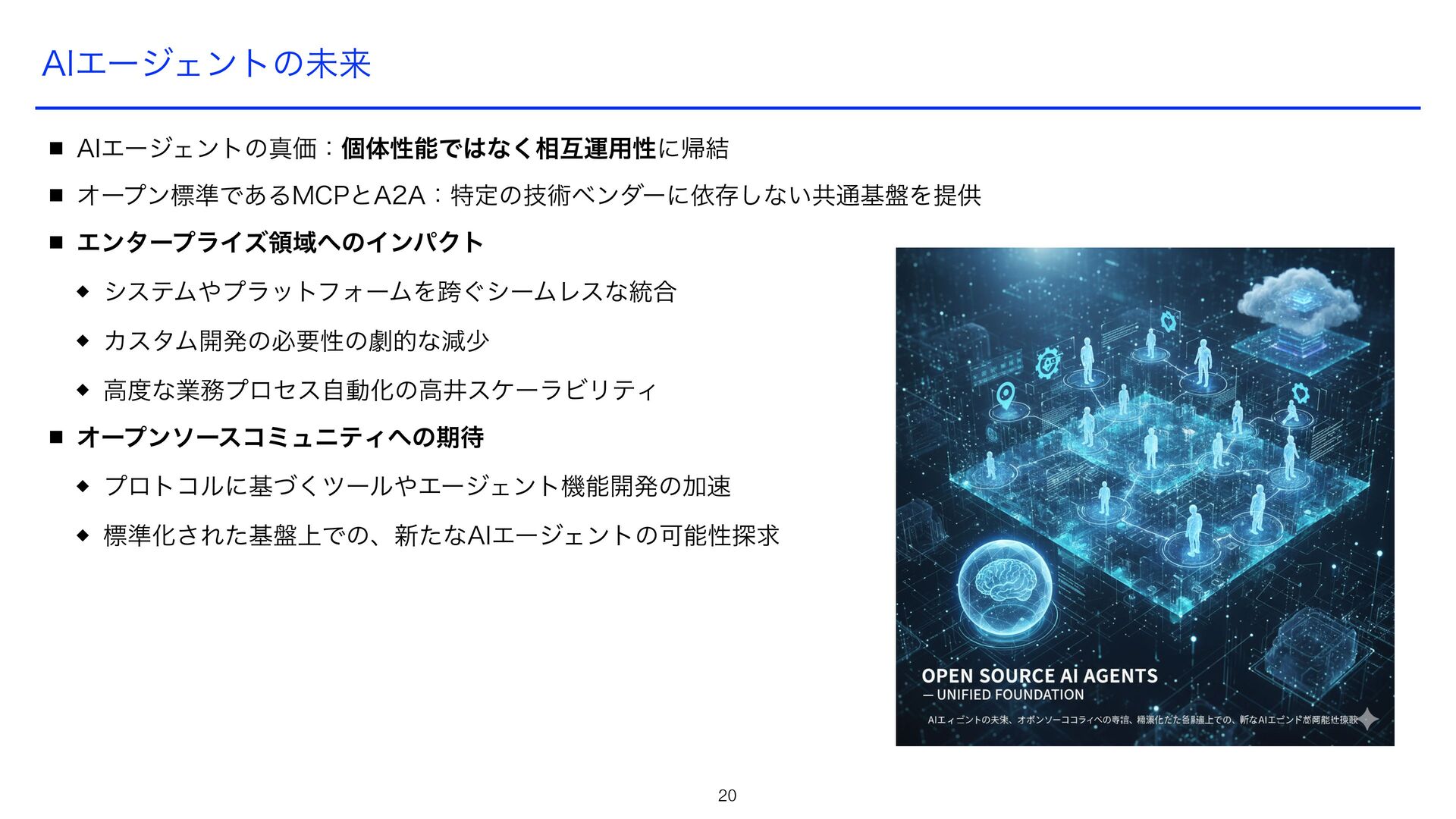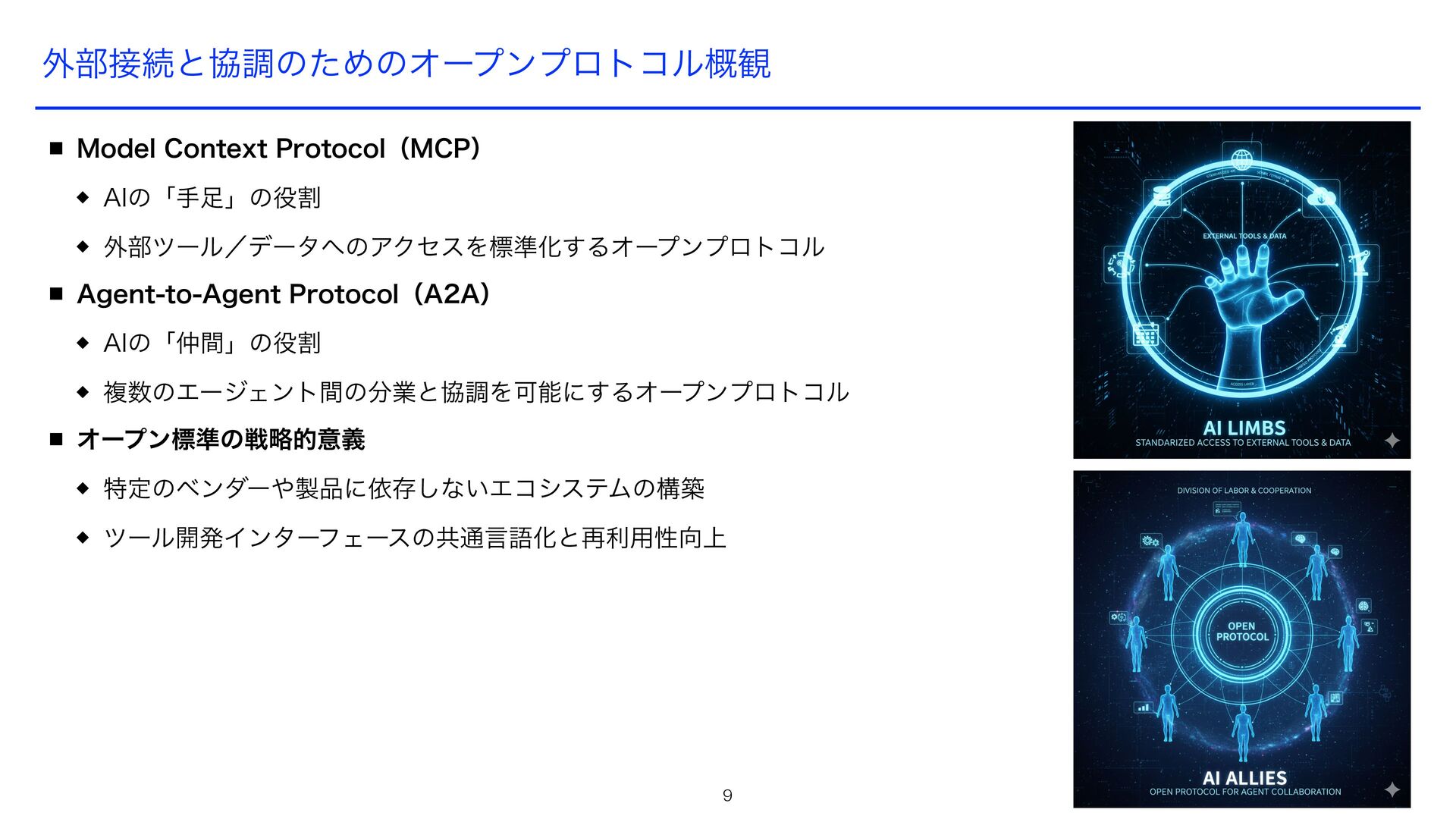 今話題となっている「AIエージェント」について、要素技術となる生成AIを用いてどのように自律的に動作するのか基礎を説明した後、AIが外部のツールやデータにアクセスするためのオープンプロトコルであるMCP(Model Context Protocol)や、複数のエージェントによる分業と連携を可能にするオープンプロトコルA2A(Agent-to-Agent)について解説しました。