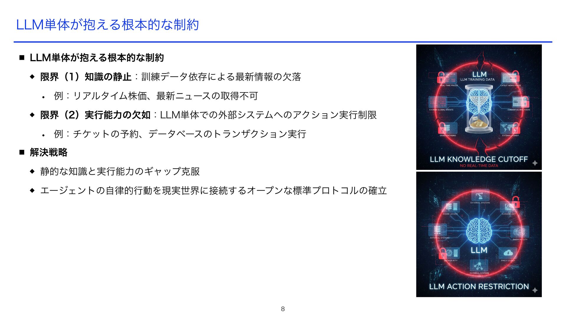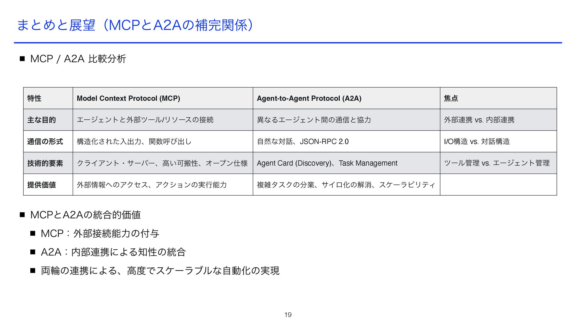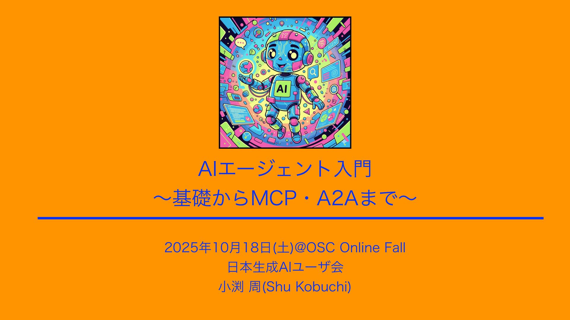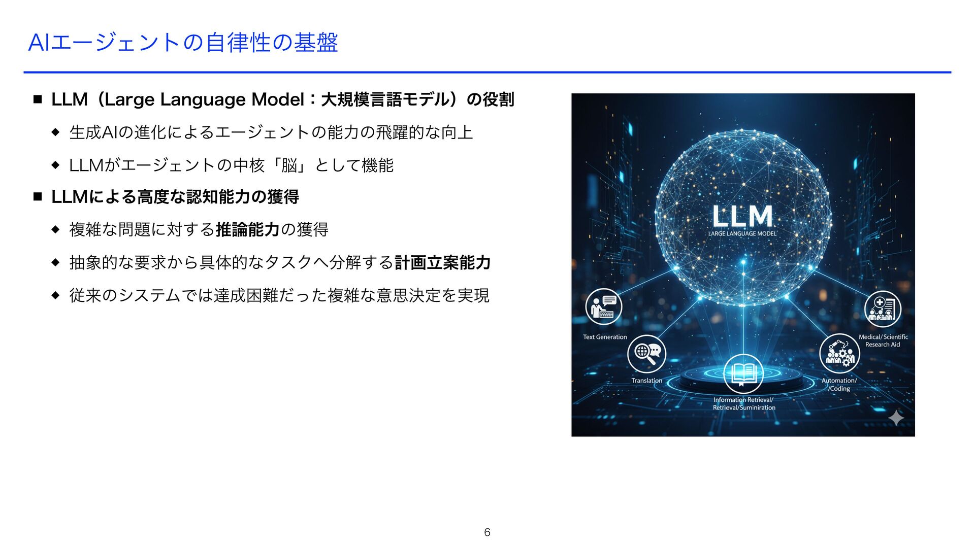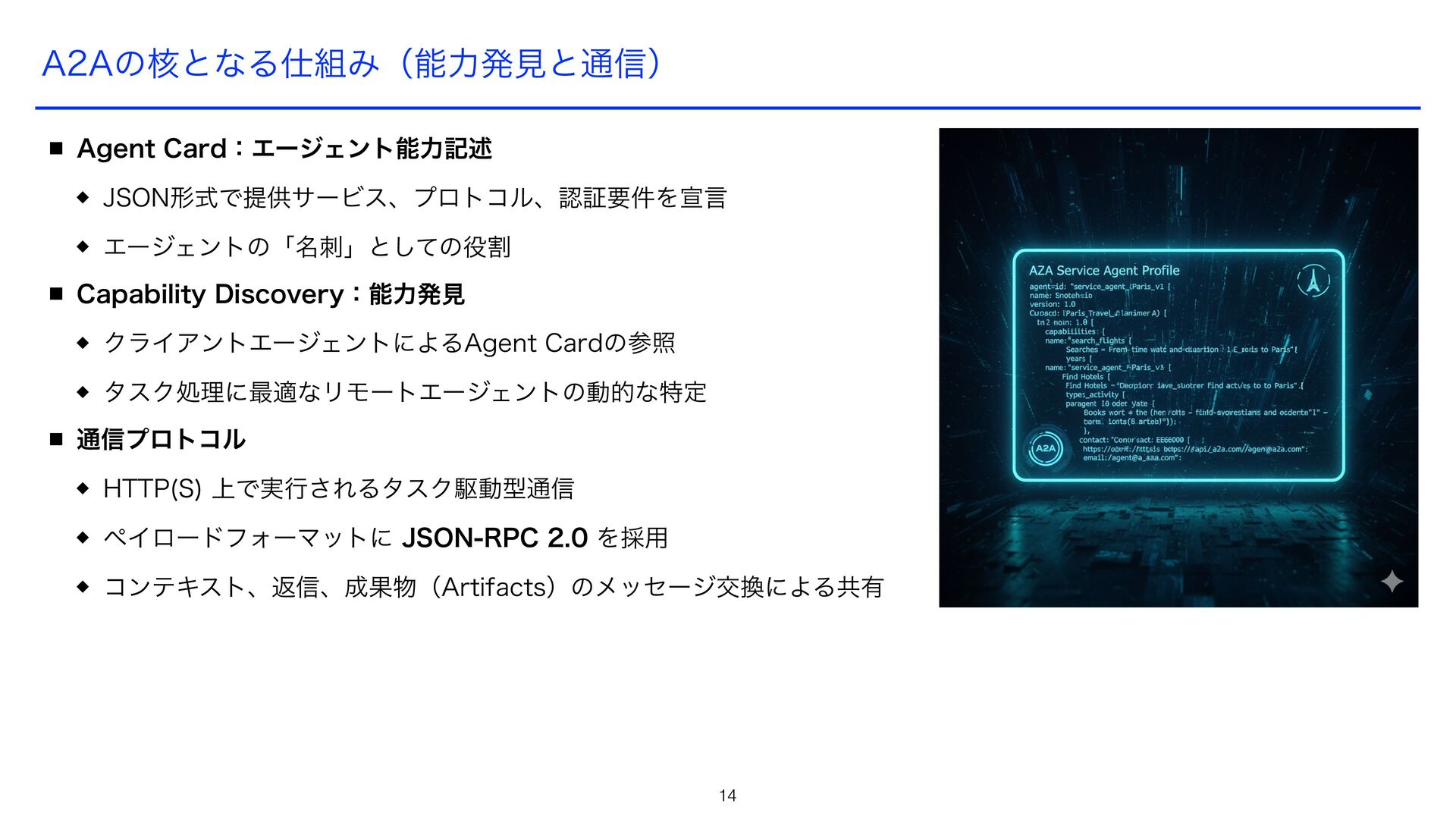 今話題となっている「AIエージェント」について、要素技術となる生成AIを用いてどのように自律的に動作するのか基礎を説明した後、AIが外部のツールやデータにアクセスするためのオープンプロトコルであるMCP(Model Context Protocol)や、複数のエージェントによる分業と連携を可能にするオープンプロトコルA2A(Agent-to-Agent)について解説しました。
