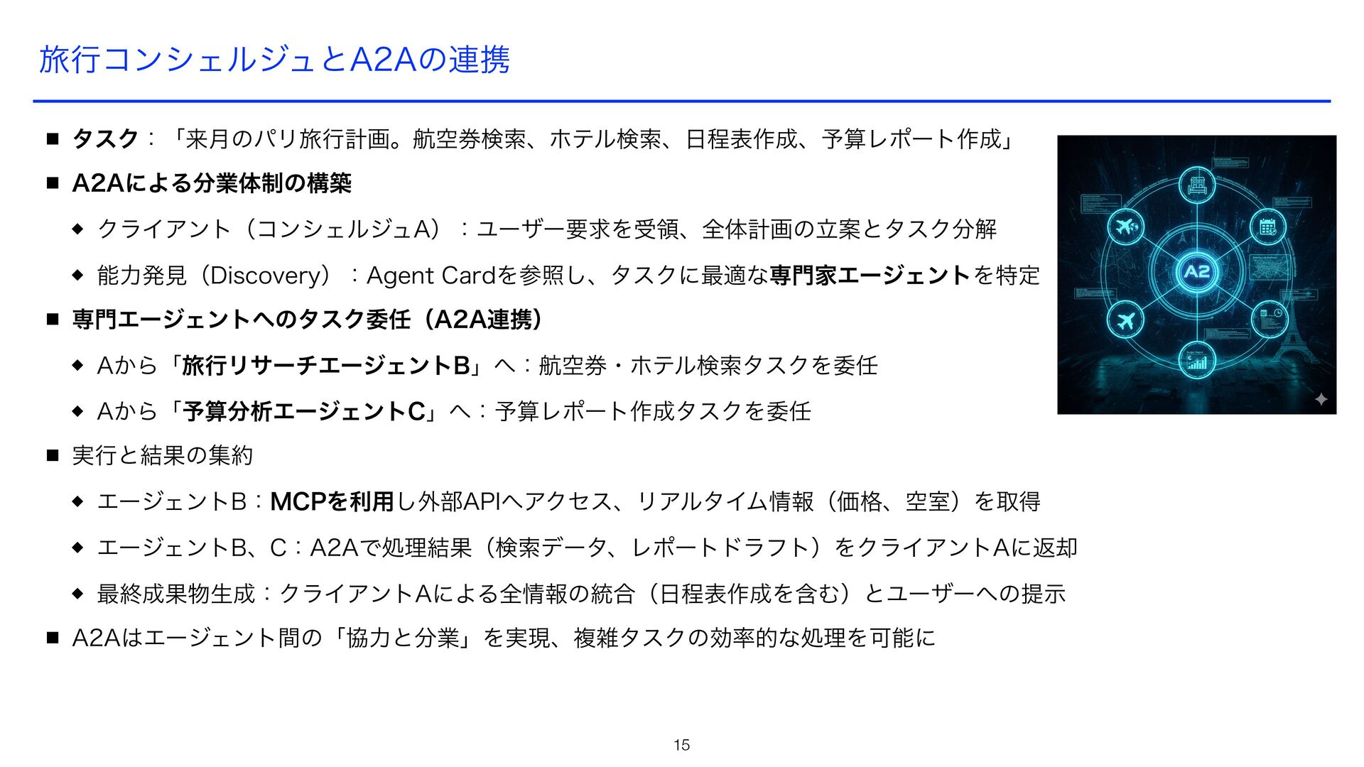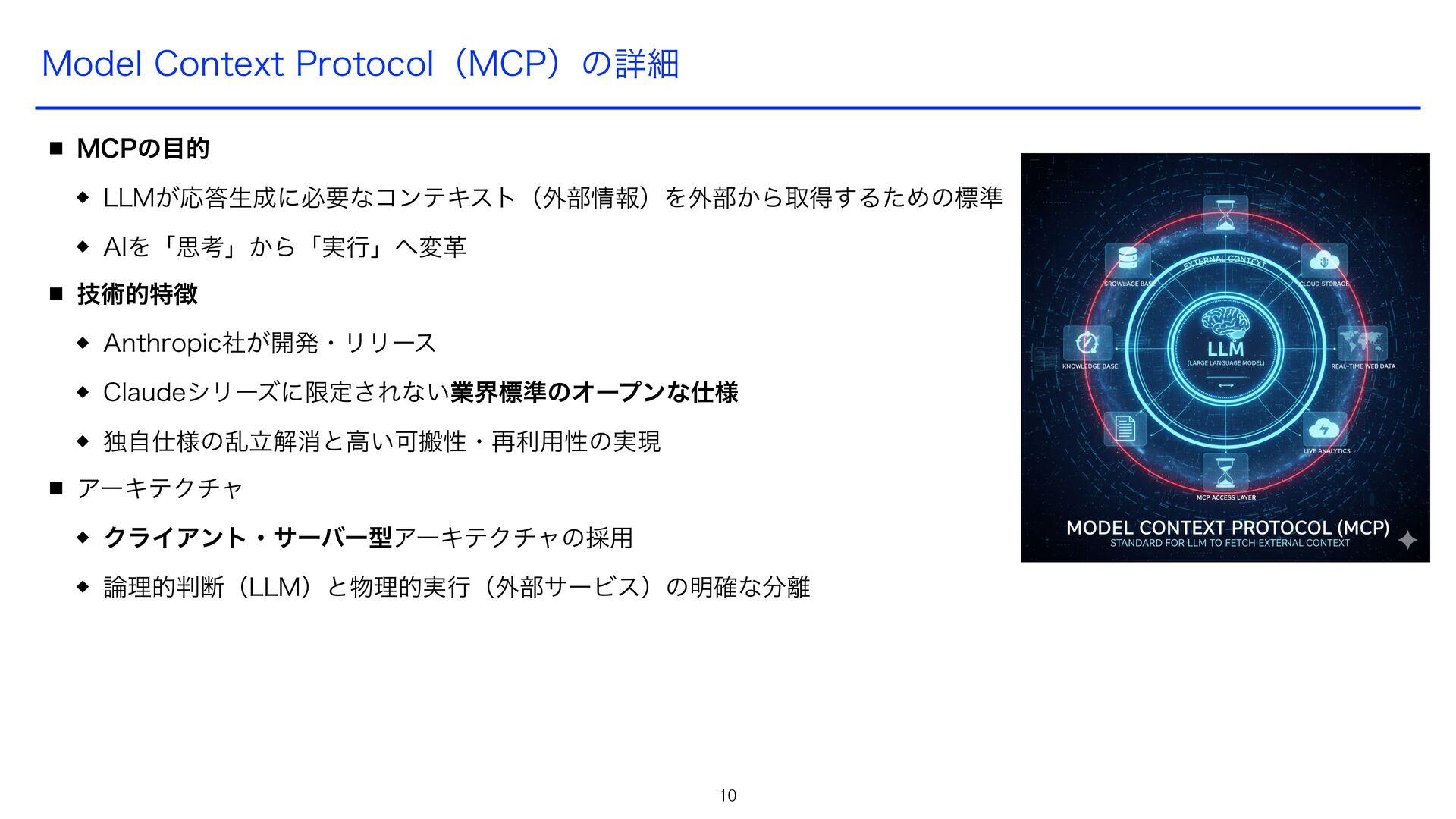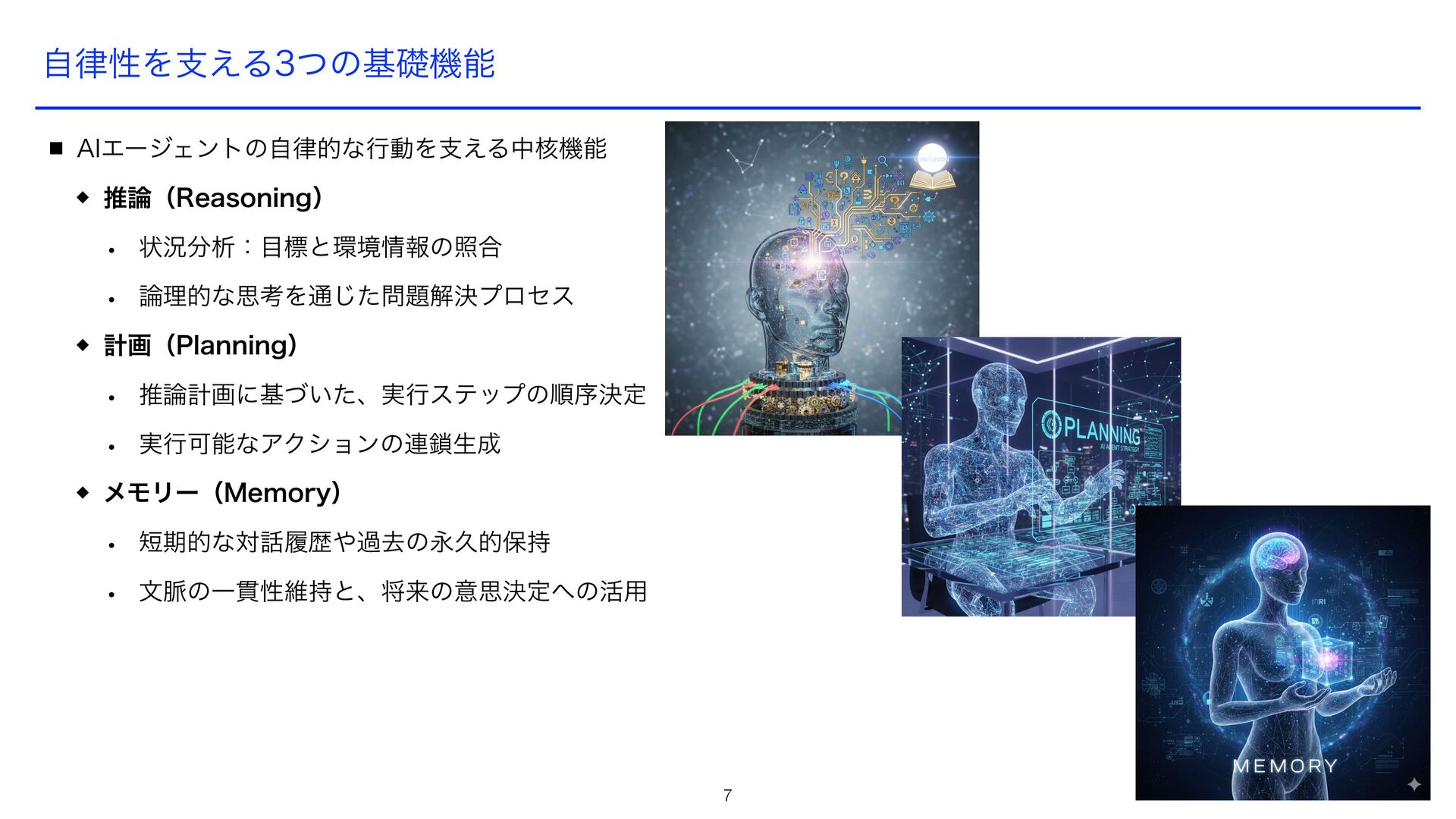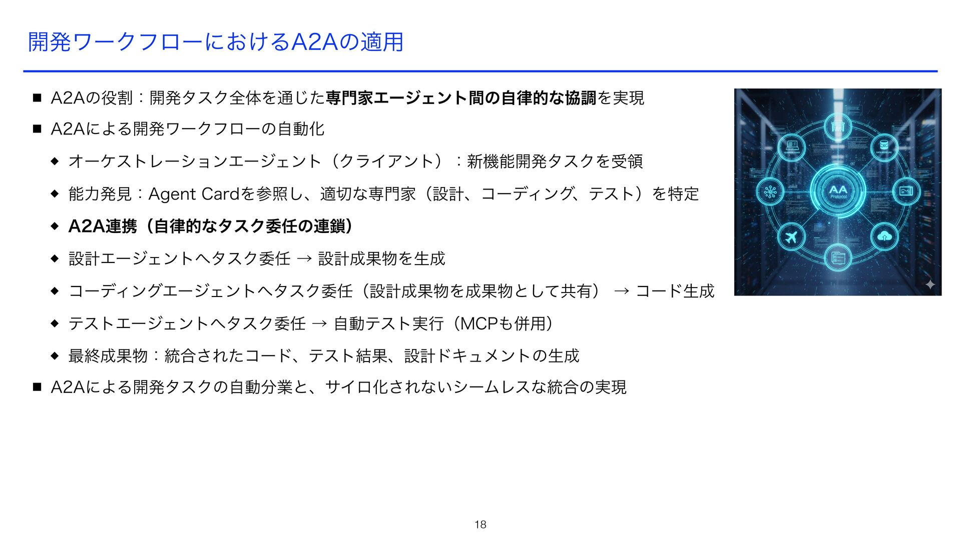 今話題となっている「AIエージェント」について、要素技術となる生成AIを用いてどのように自律的に動作するのか基礎を説明した後、AIが外部のツールやデータにアクセスするためのオープンプロトコルであるMCP(Model Context Protocol)や、複数のエージェントによる分業と連携を可能にするオープンプロトコルA2A(Agent-to-Agent)について解説しました。