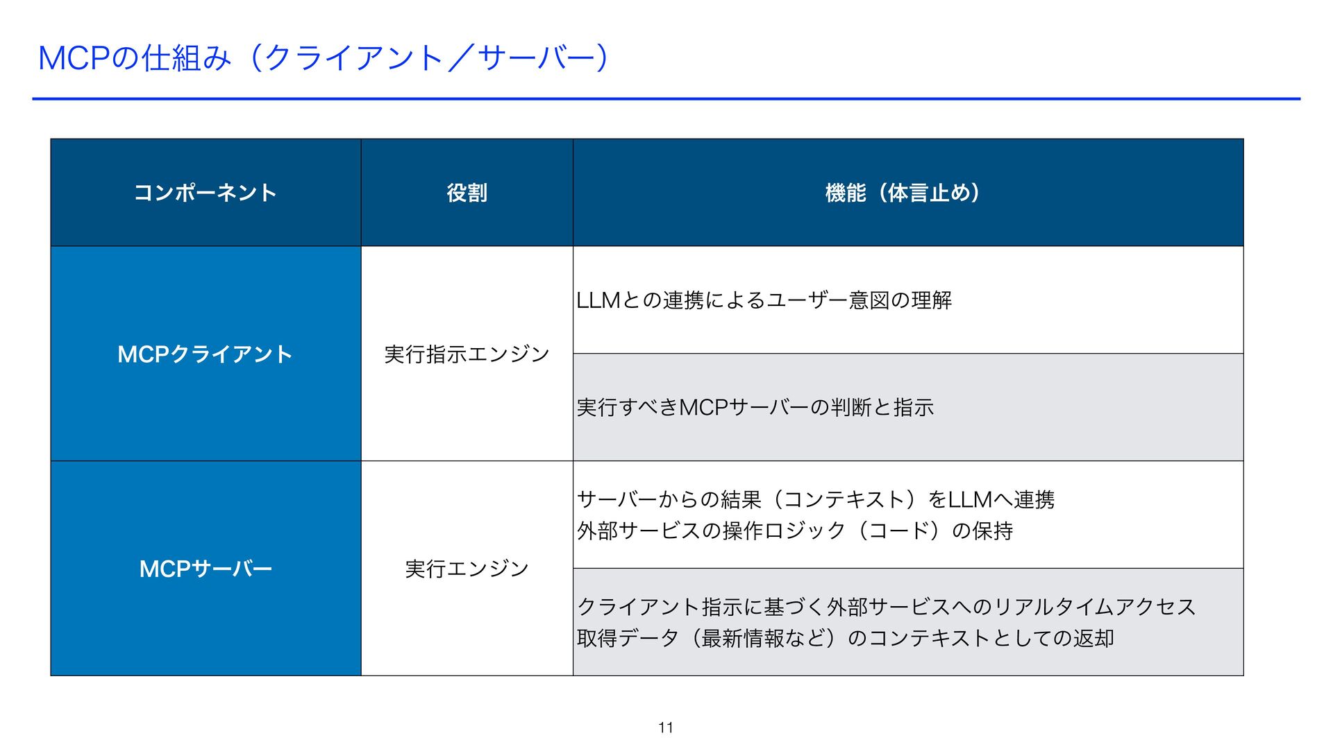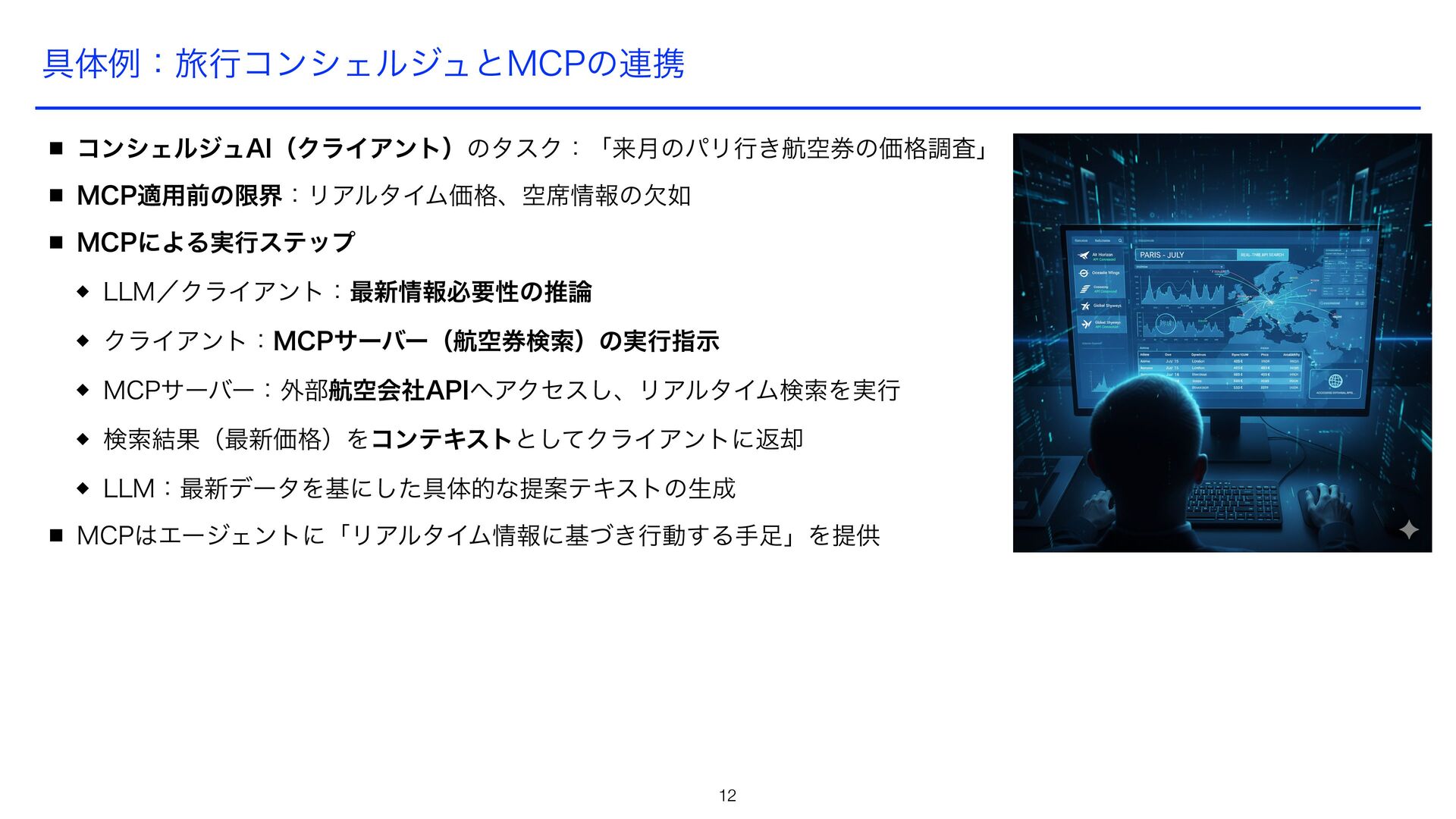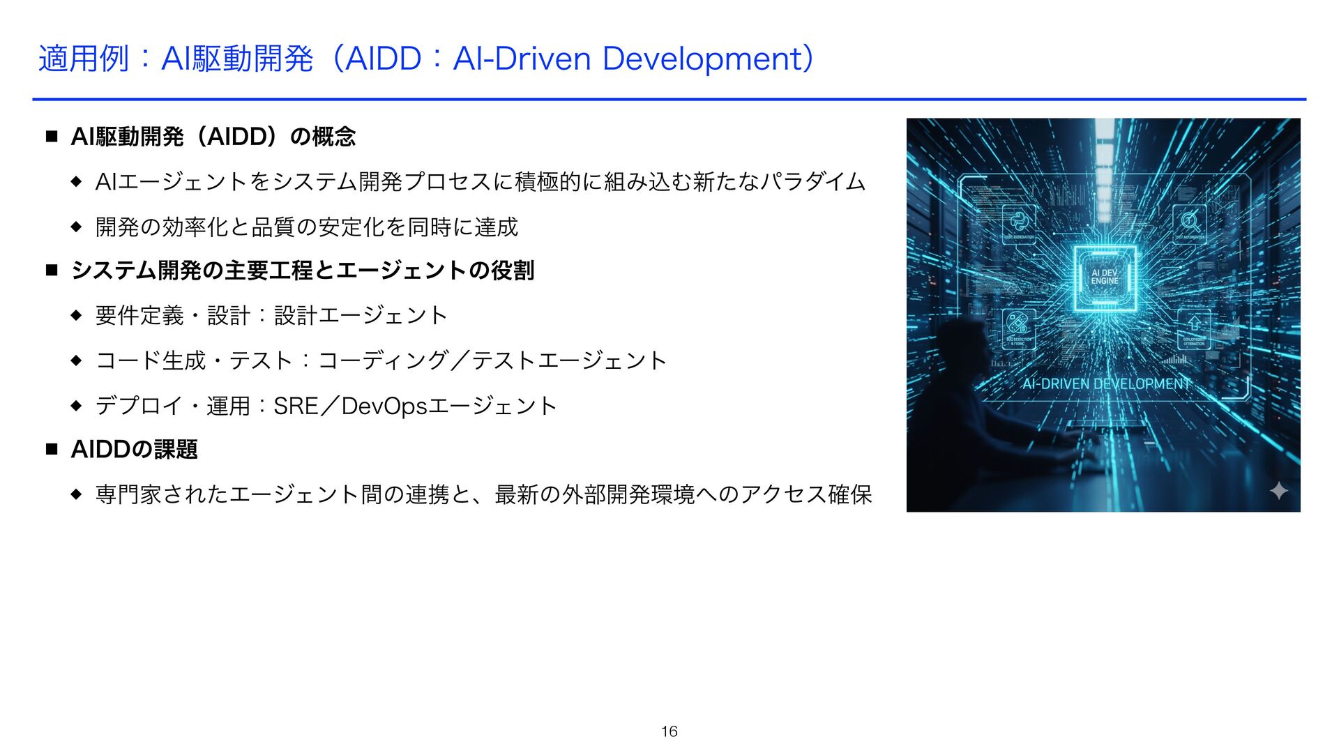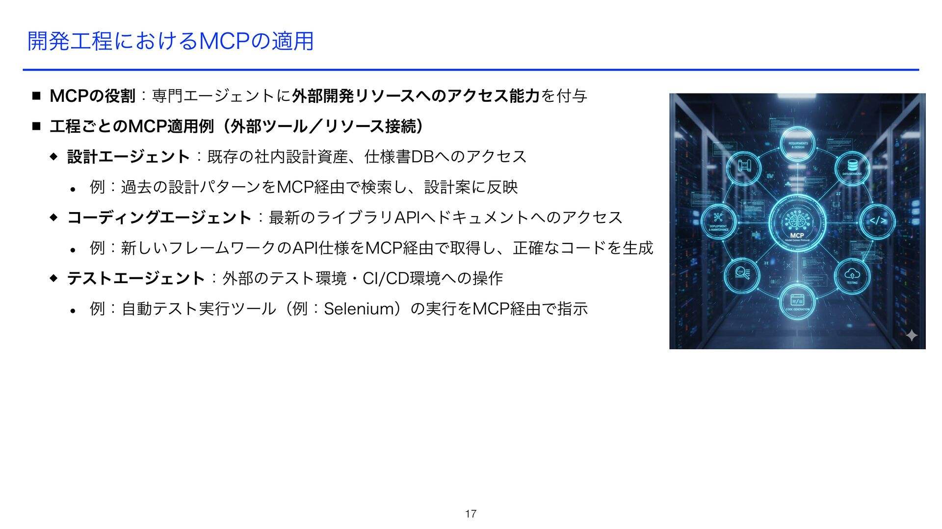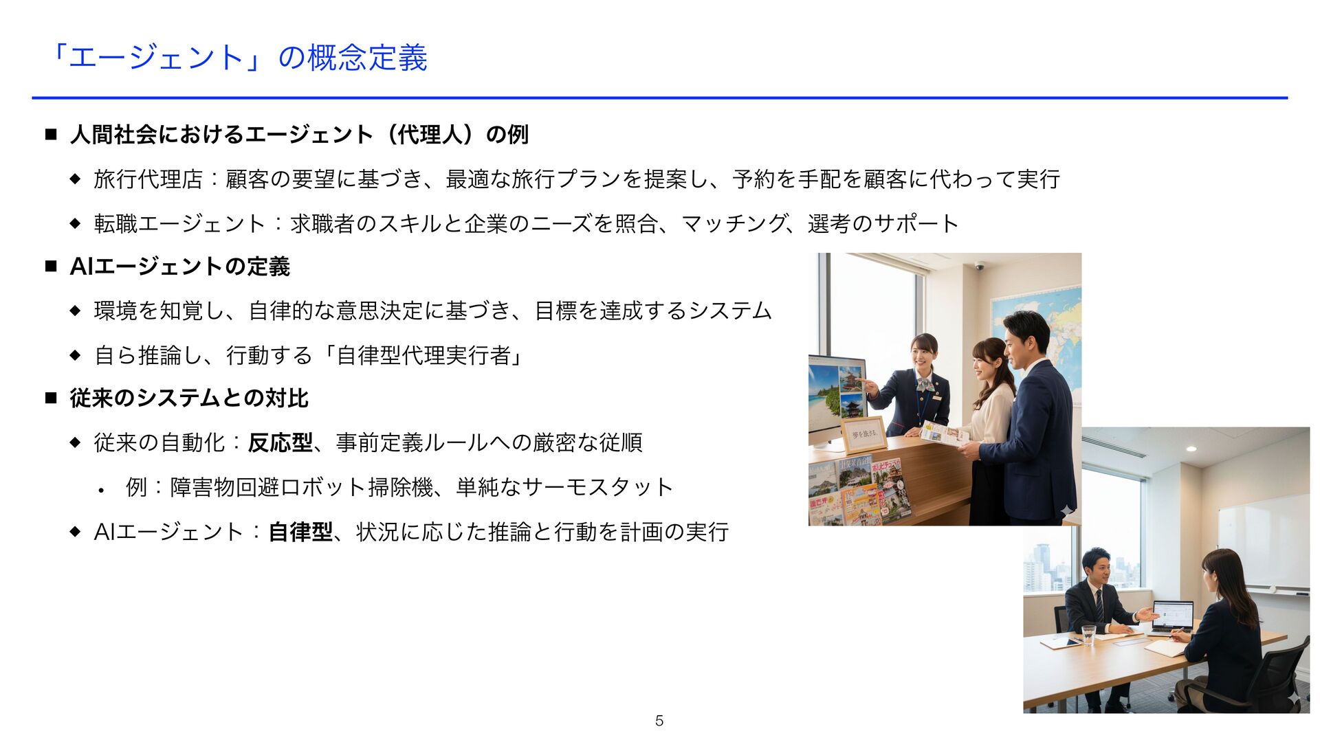 今話題となっている「AIエージェント」について、要素技術となる生成AIを用いてどのように自律的に動作するのか基礎を説明した後、AIが外部のツールやデータにアクセスするためのオープンプロトコルであるMCP(Model Context Protocol)や、複数のエージェントによる分業と連携を可能にするオープンプロトコルA2A(Agent-to-Agent)について解説しました。