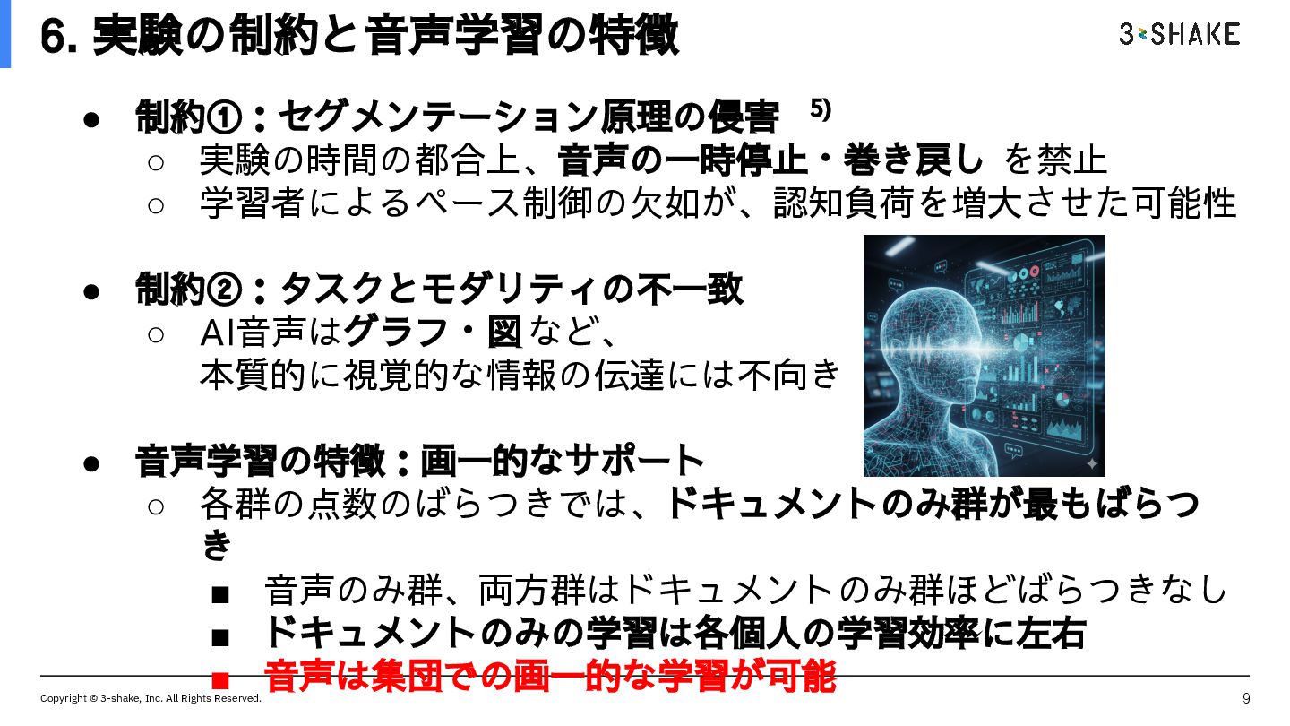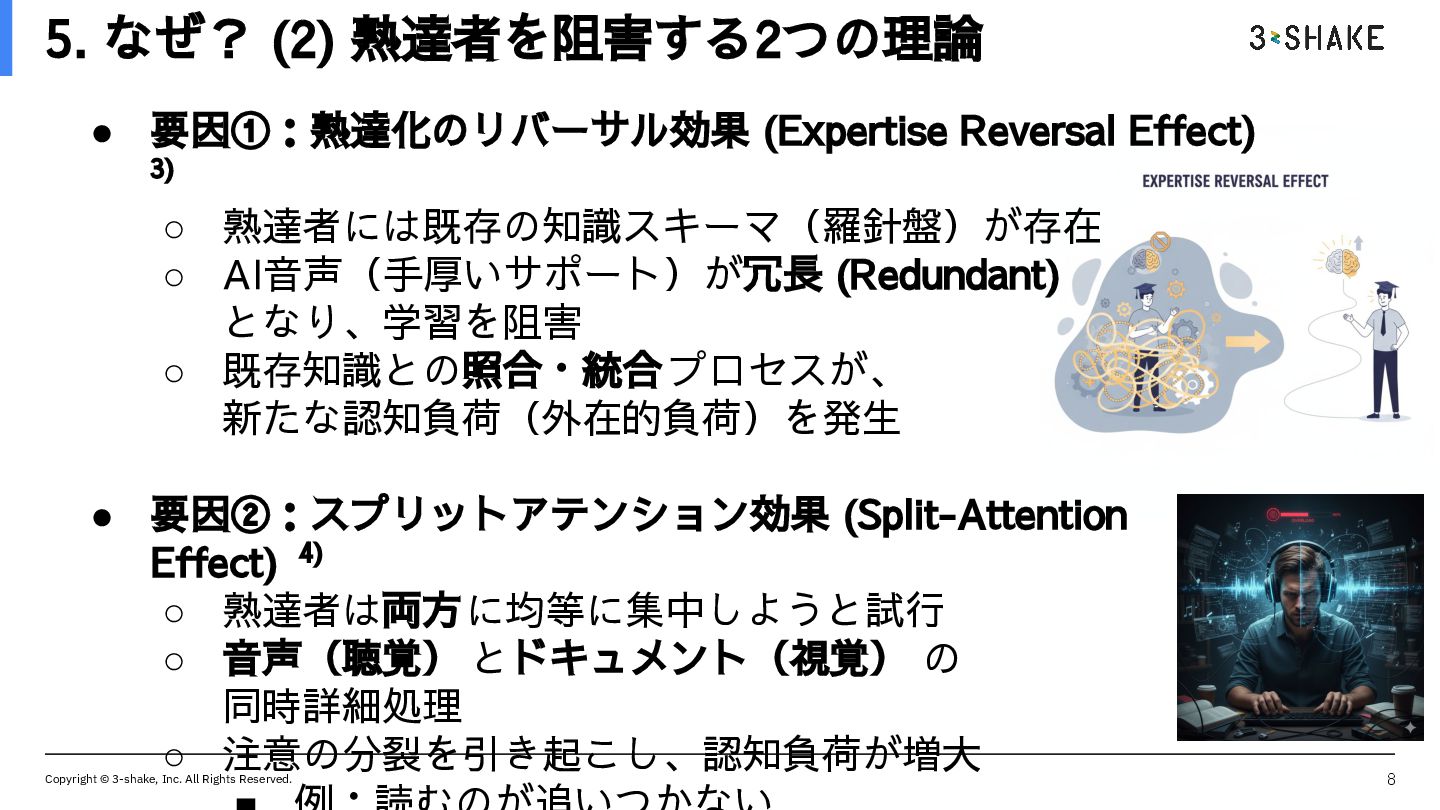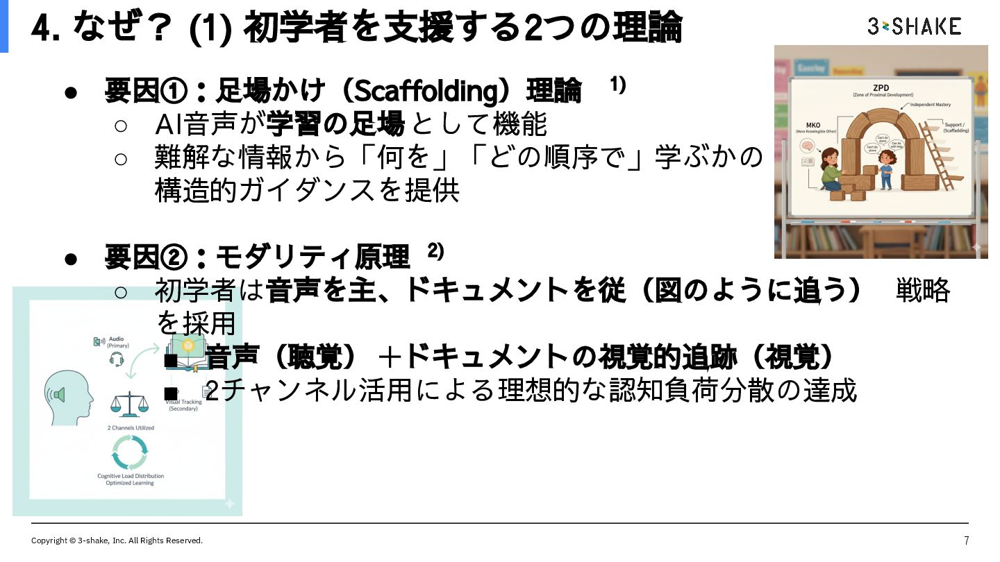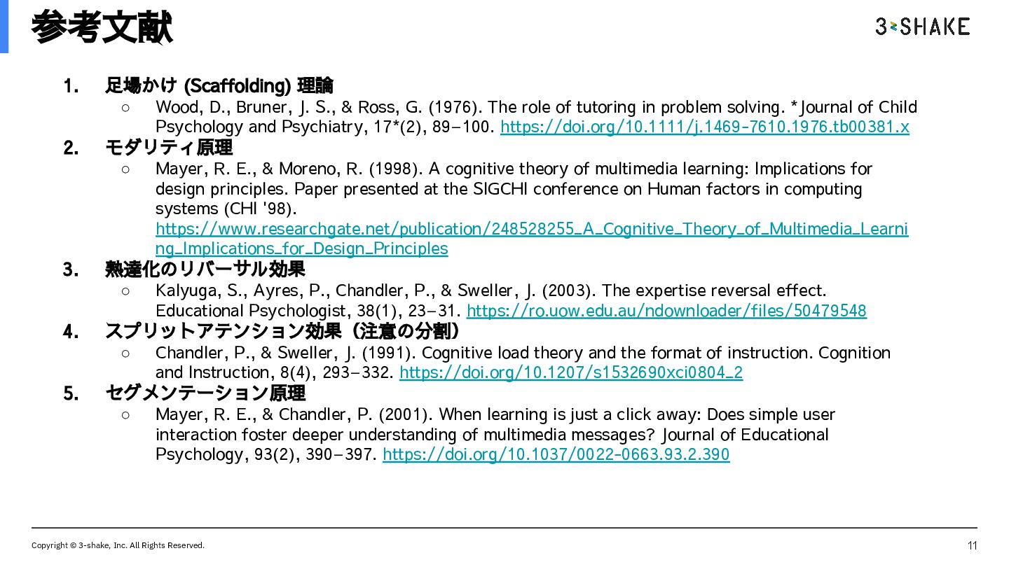 足場かけ (Scaffolding) 理論 ◦ Wood, D., Bruner, J. S., & Ross, G. (1976). The role of tutoring in problem solving. *Journal of Child Psychology and Psychiatry, 17*(2), 89–100. https://doi.org/10.1111/j.1469-7610.1976.tb00381.x 2. モダリティ原理 ◦ Mayer, R. E., & Moreno, R. (1998). A cognitive theory of multimedia learning: Implications for design principles. Paper presented at the SIGCHI conference on Human factors in computing systems (CHI '98). https://www.researchgate.net/publication/248528255_A_Cognitive_Theory_of_Multimedia_Learni ng_Implications_for_Design_Principles 3. 熟達化のリバーサル効果 ◦ Kalyuga, S., Ayres, P., Chandler, P., & Sweller, J. (2003). The expertise reversal effect. Educational Psychologist, 38(1), 23–31. https://ro.uow.edu.au/ndownloader/files/50479548 4. スプリットアテンション効果(注意の分割) ◦ Chandler, P., & Sweller, J. (1991). Cognitive load theory and the format of instruction. Cognition and Instruction, 8(4), 293–332. https://doi.org/10.1207/s1532690xci0804_2 5. セグメンテーション原理 ◦ Mayer, R. E., & Chandler, P. (2001). When learning is just a click away: Does simple user interaction foster deeper understanding of multimedia messages? Journal of Educational Psychology, 93(2), 390–397. https://doi.org/10.1037/0022-0663.93.2.390