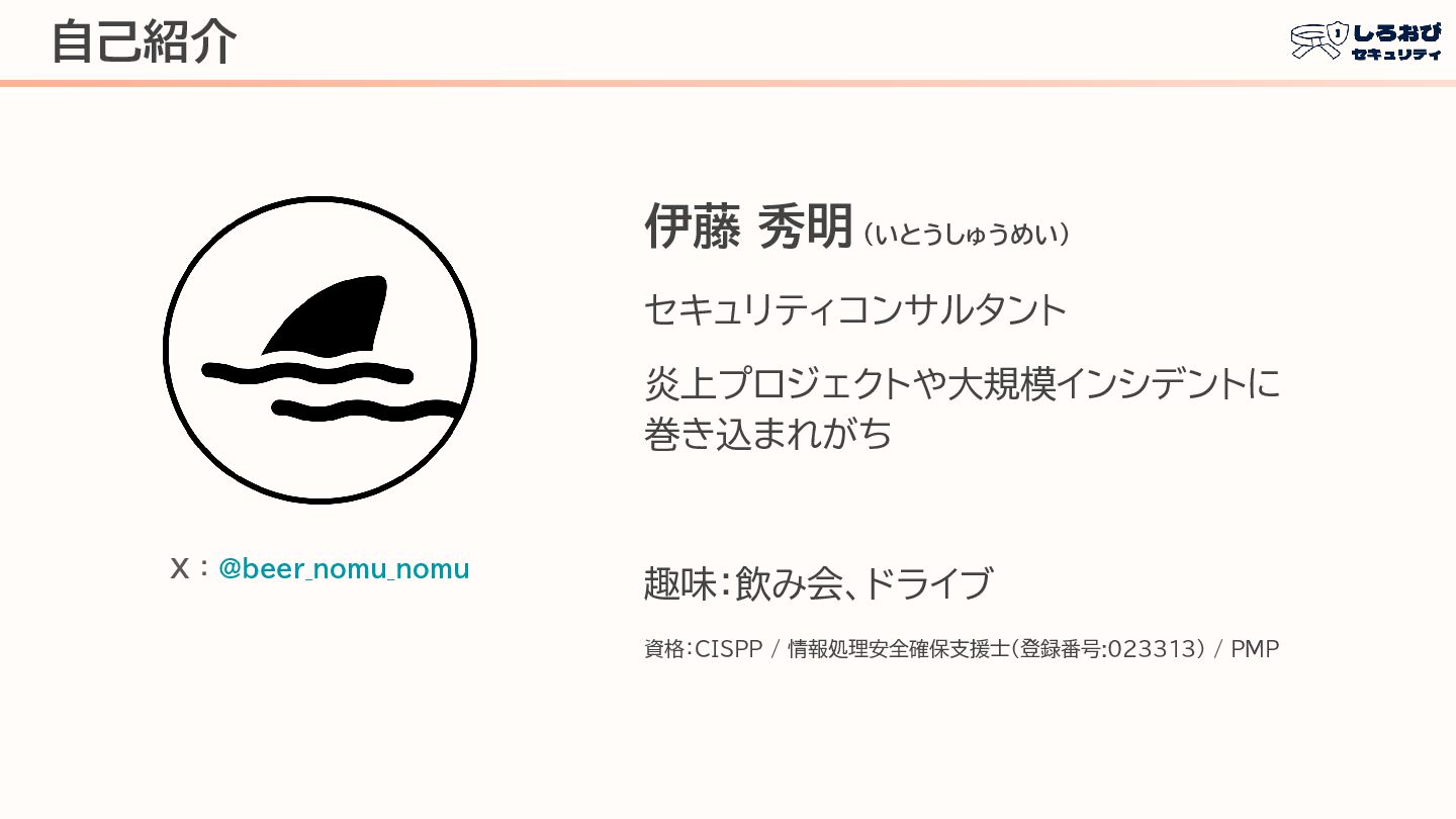 自己紹介 伊藤 秀明 (いとうしゅうめい) セキュリティコンサルタント 炎上プロジェクトや大規模インシデントに 巻き込まれがち 趣味:飲み会、ドライブ 資格:CISPP /