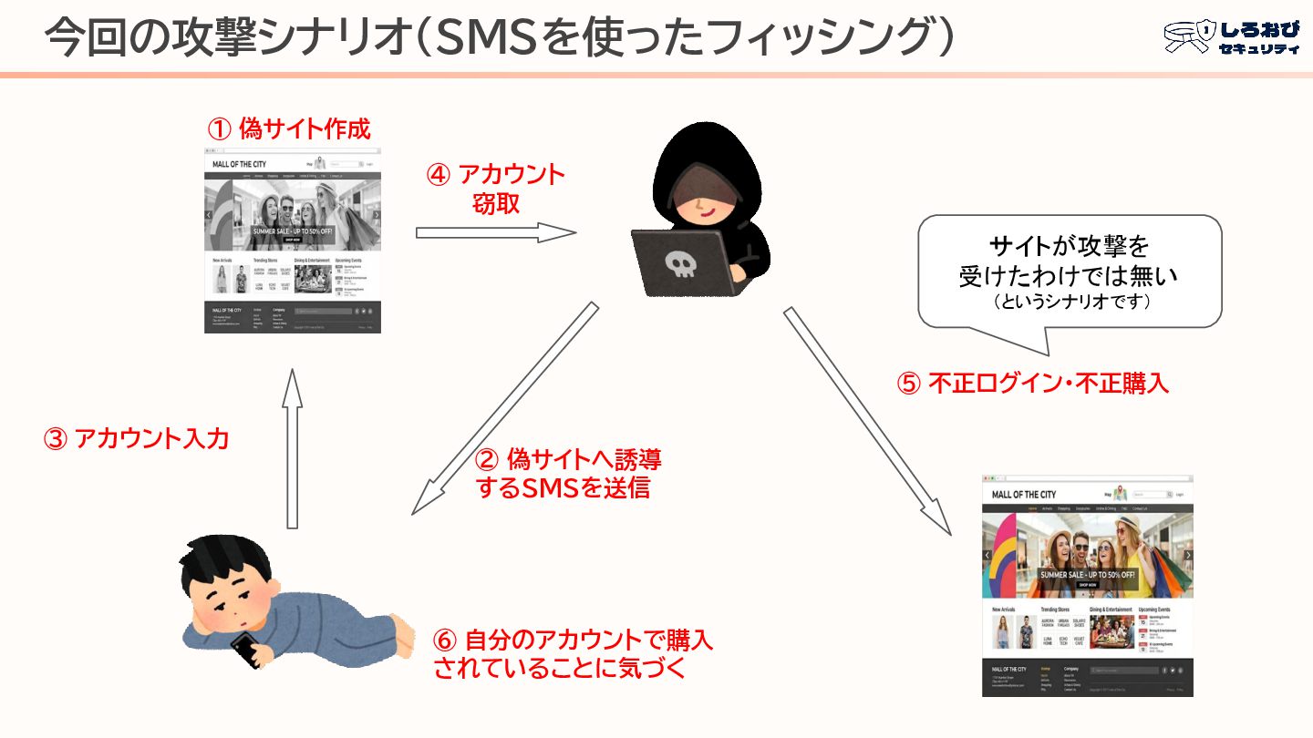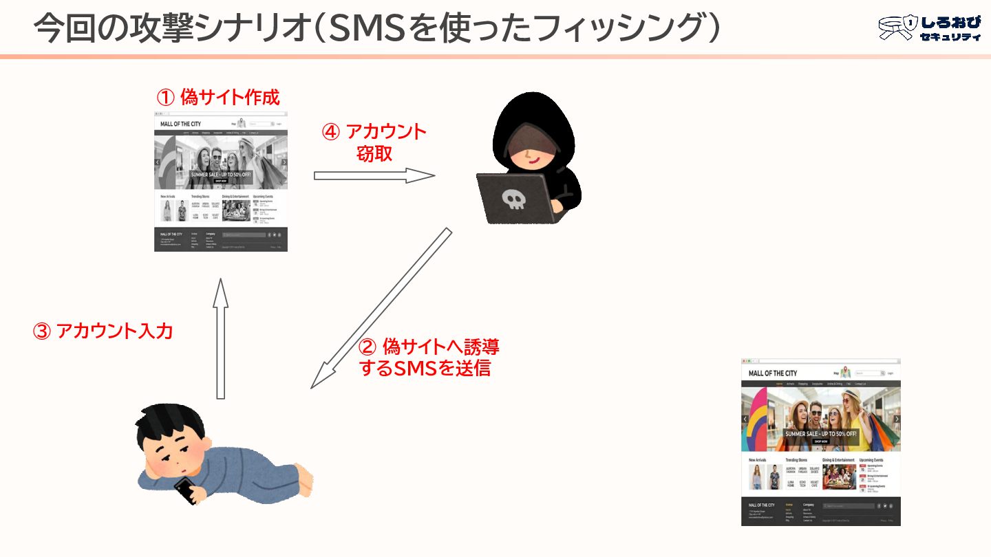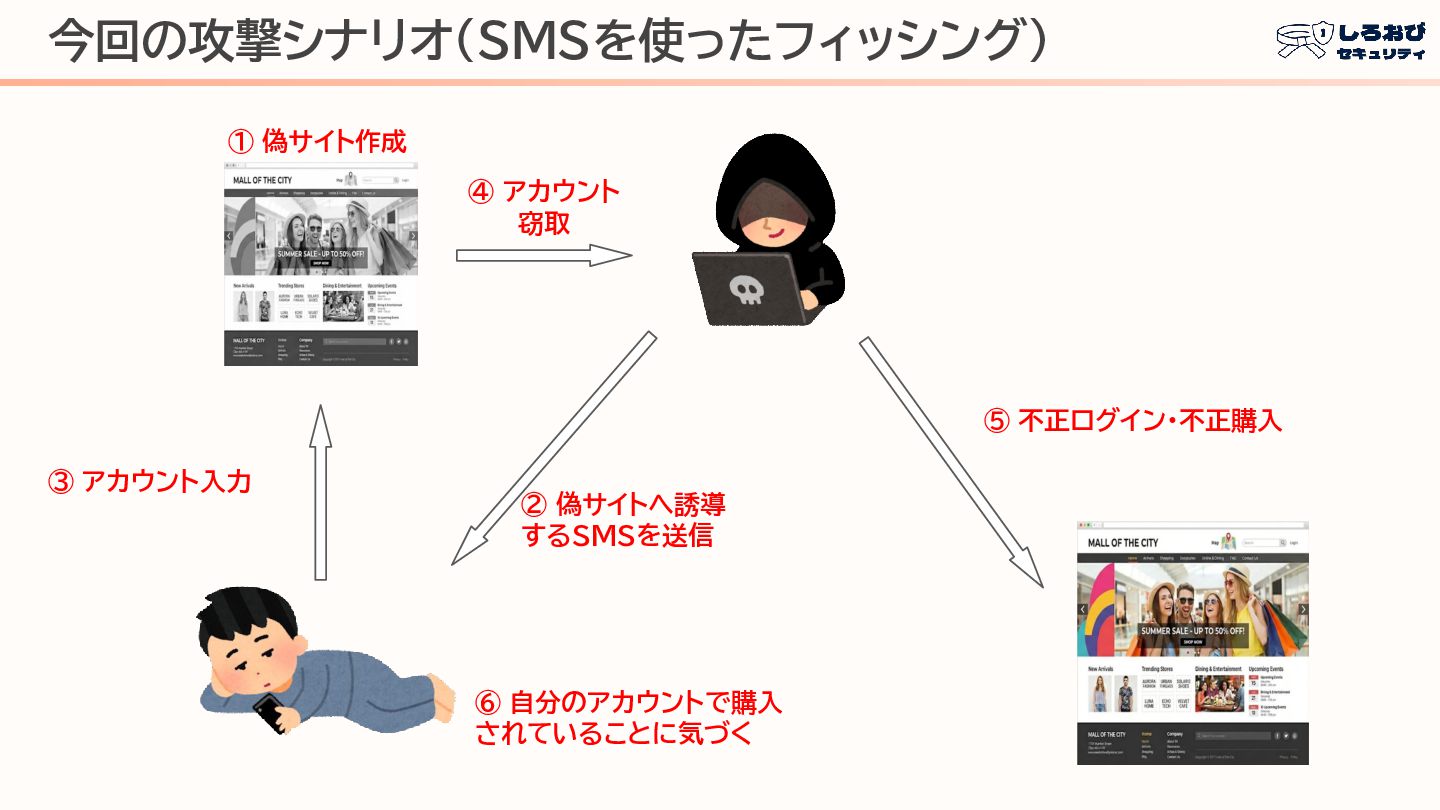 今回の攻撃シナリオ(SMSを使ったフィッシング) ① 偽サイト作成 ② 偽サイトへ誘導 するSMSを送信 ③ アカウント入力 ④ アカウント