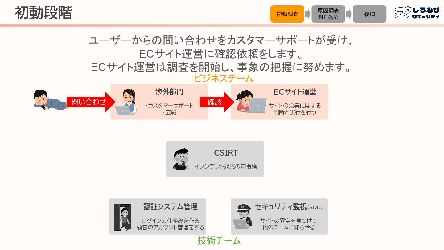 サイトの異常を見つけて 他のチームに知らせる CSIRT インシデント対応の司令塔 初動段階 ビジネスチーム 技術チーム 初動調査 原因調査 封じ込め 復旧 問い合わせ 確認 ユーザーからの問い合わせをカスタマーサポートが受け、 ECサイト運営に確認依頼をします。 ECサイト運営は調査を開始し、事象の把握に努めます。