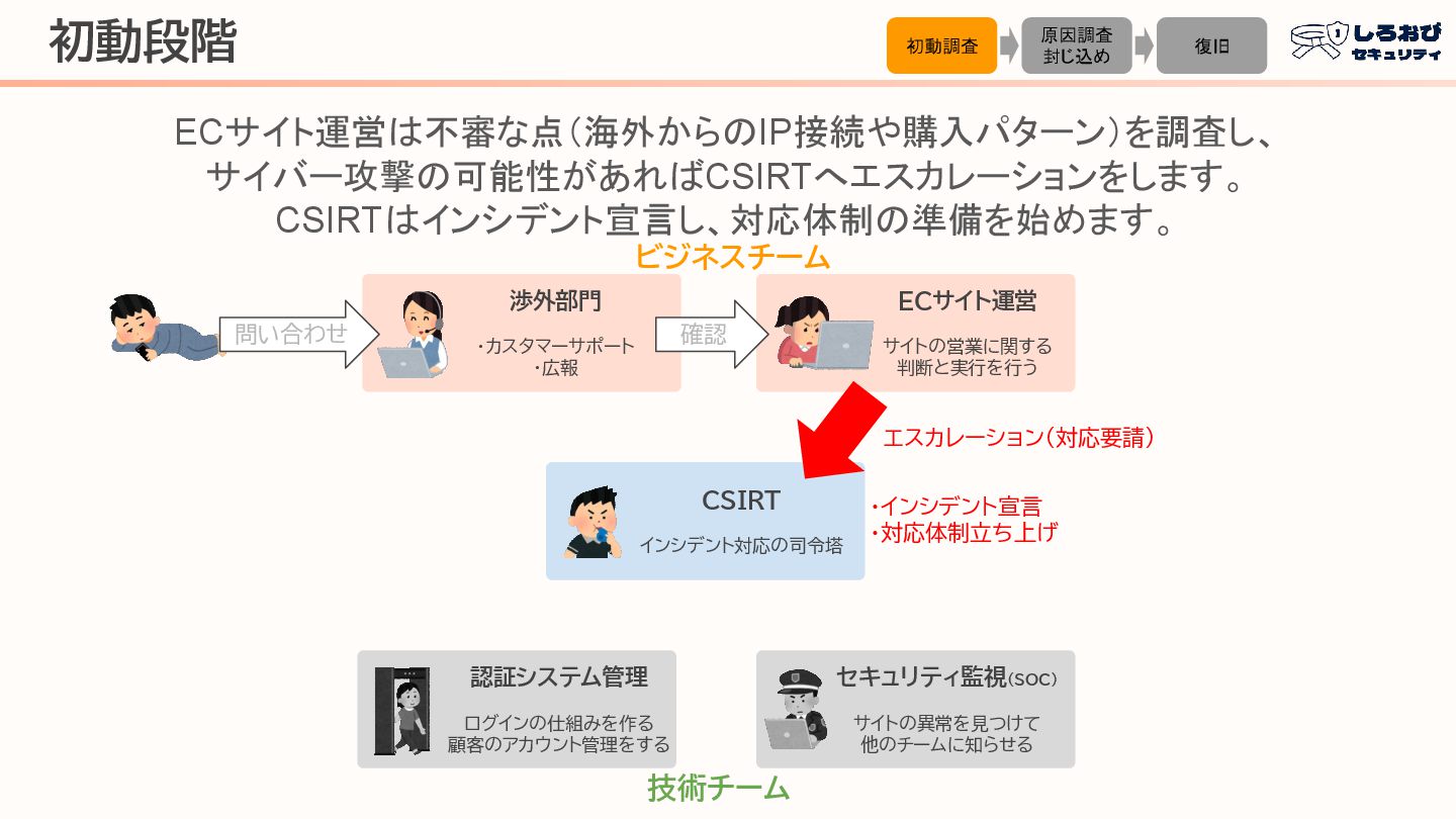 サイトの異常を見つけて 他のチームに知らせる CSIRT インシデント対応の司令塔 初動段階 ビジネスチーム 技術チーム 初動調査 原因調査 封じ込め 復旧 問い合わせ 確認 ECサイト運営は不審な点(海外からのIP接続や購入パターン)を調査し、 サイバー攻撃の可能性があればCSIRTへエスカレーションをします。 CSIRTはインシデント宣言し、対応体制の準備を始めます。 エスカレーション(対応要請) ・インシデント宣言 ・対応体制立ち上げ