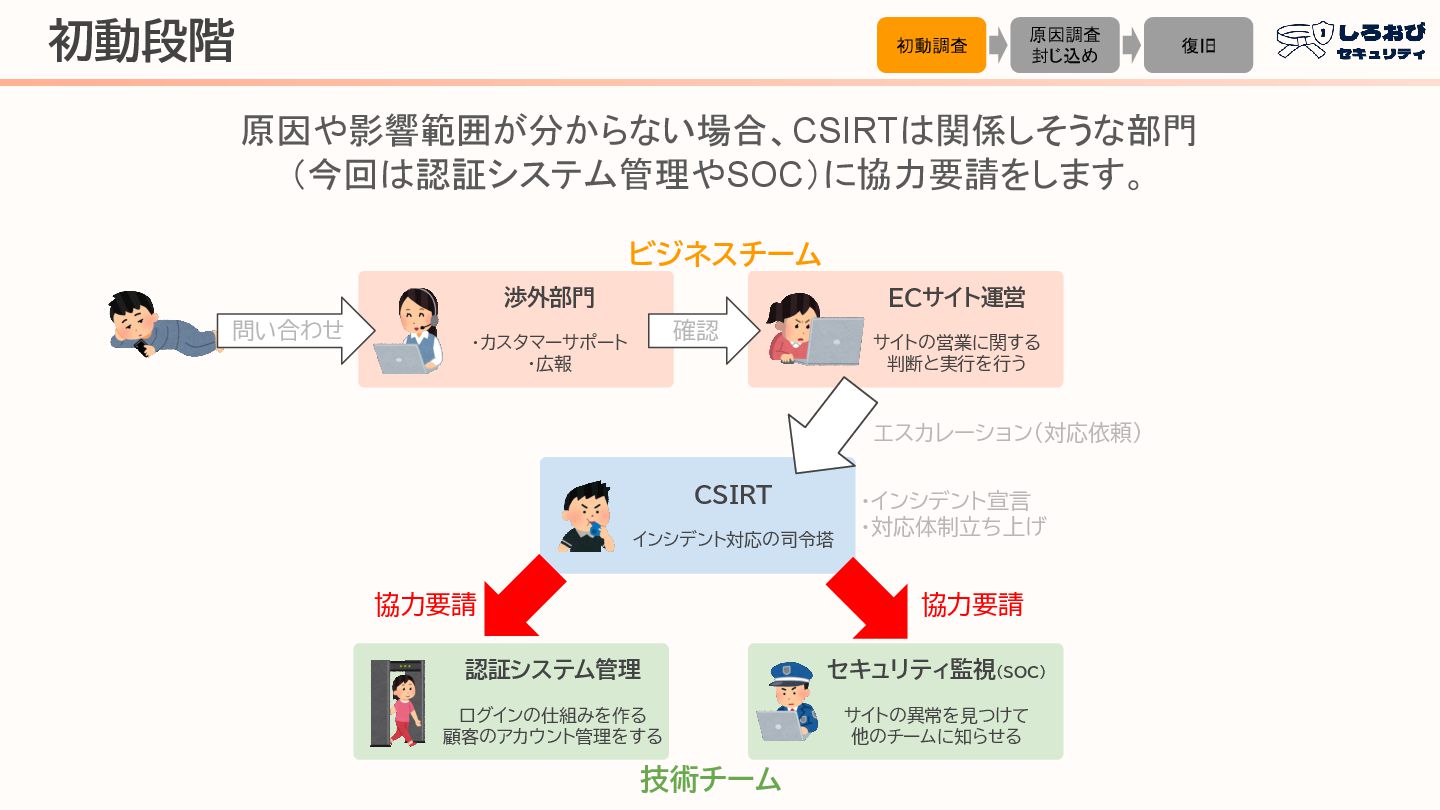 サイトの異常を見つけて 他のチームに知らせる CSIRT インシデント対応の司令塔 初動段階 ビジネスチーム 技術チーム 初動調査 原因調査 封じ込め 復旧 原因や影響範囲が分からない場合、CSIRTは関係しそうな部門 (今回は認証システム管理やSOC)に協力要請をします。 エスカレーション(対応依頼) ・インシデント宣言 ・対応体制立ち上げ 協力要請 協力要請 問い合わせ 確認