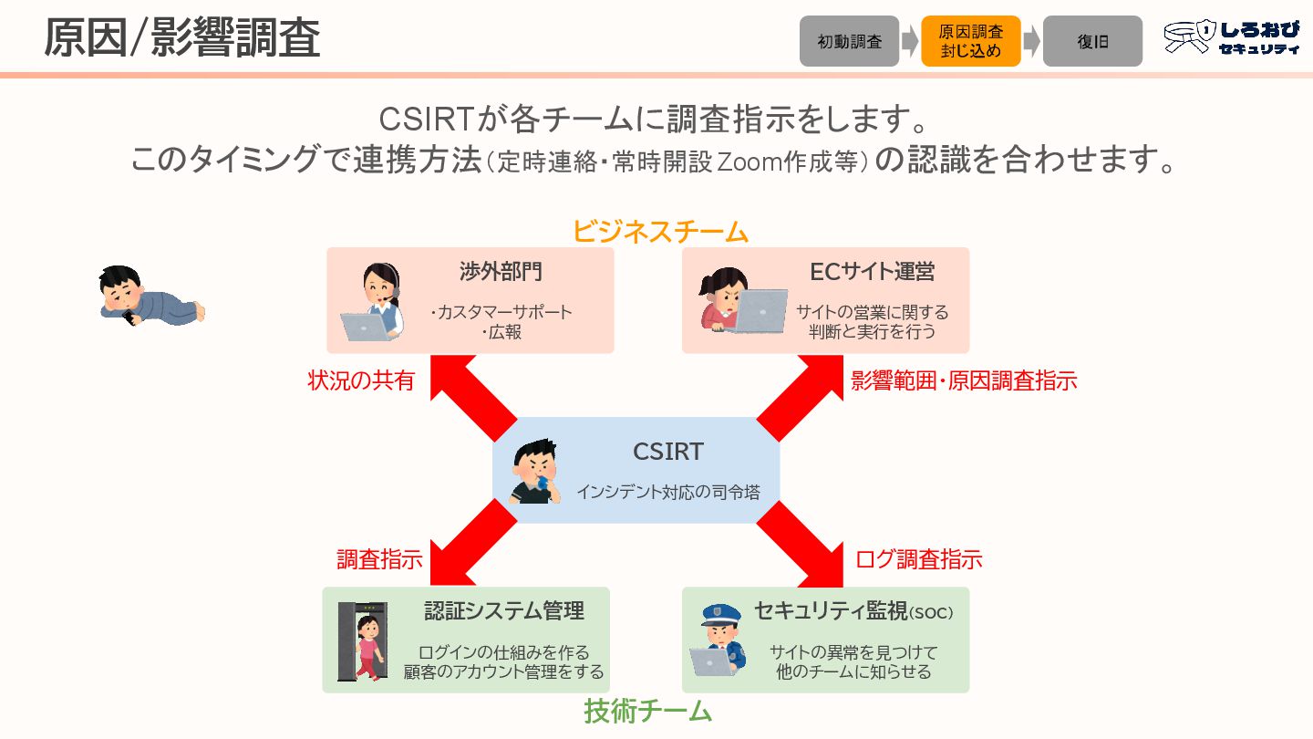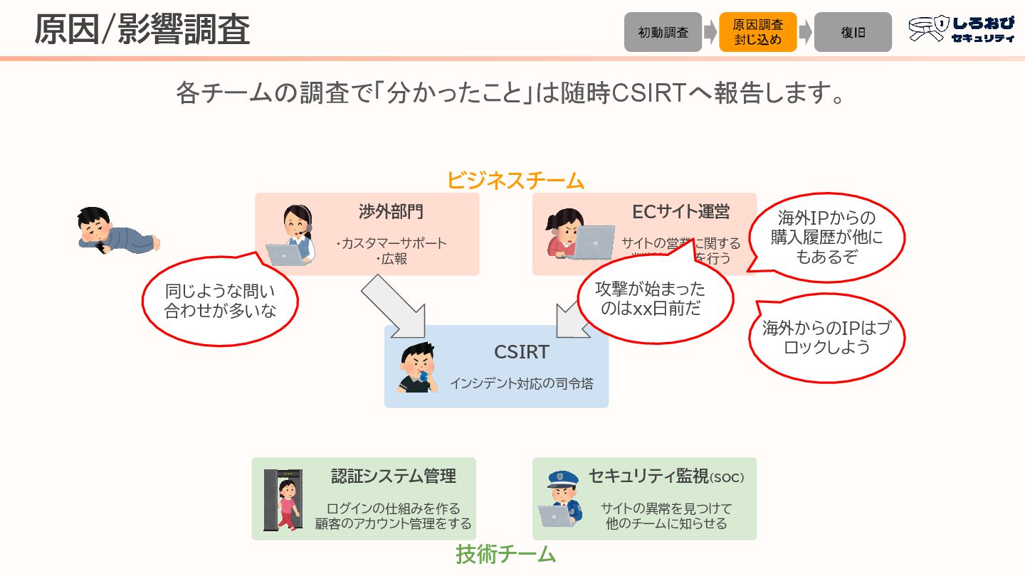 サイトの異常を見つけて 他のチームに知らせる CSIRT インシデント対応の司令塔 原因/影響調査 ビジネスチーム 技術チーム 各チームの調査で「分かったこと」は随時CSIRTへ報告します。 初動調査 原因調査 封じ込め 復旧 海外IPからの 購入履歴が他に もあるぞ 海外からのIPはブ ロックしよう 同じような問い 合わせが多いな 攻撃が始まった のはxx日前だ