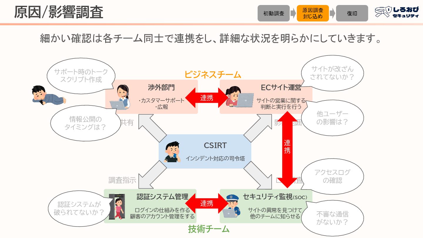 サイトの異常を見つけて 他のチームに知らせる CSIRT インシデント対応の司令塔 原因/影響調査 ビジネスチーム 技術チーム 細かい確認は各チーム同士で連携をし、詳細な状況を明らかにしていきます。 初動調査 原因調査 封じ込め 復旧 状況の共有 調査指示 ログ調査指示 影響範囲・原因調査指示 認証システムが 破られてないか? サポート時のトーク スクリプト作成 情報公開の タイミングは? 他ユーザー の影響は? サイトが改ざん されてないか? 不審な通信 がないか? アクセスログ の確認 連 携 連携 連携