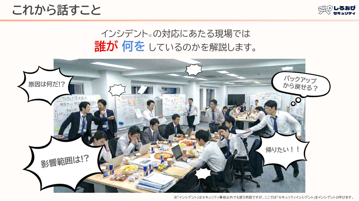これから話すこと インシデント※ の対応にあたる現場では 誰が 何を しているのかを解説します。 影響範囲は!? 原因は何だ!? 帰りたい!! ※「インシデント」はセキュリティ事故以外でも使う用語ですが、ここでは「セキュリティインシデント」をインシデントと呼びます。