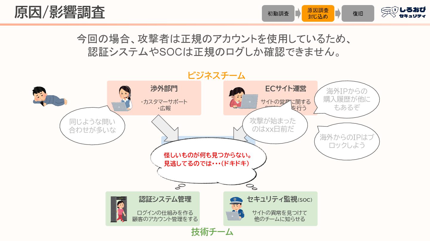 サイトの異常を見つけて 他のチームに知らせる CSIRT インシデント対応の司令塔 原因/影響調査 ビジネスチーム 技術チーム 今回の場合、攻撃者は正規のアカウントを使用しているため、 認証システムやSOCは正規のログしか確認できません。 初動調査 原因調査 封じ込め 復旧 同じような問い 合わせが多いな 攻撃が始まった のはxx日前だ 怪しいものが何も見つからない。 見逃してるのでは・・・(ドキドキ) 海外IPからの 購入履歴が他に もあるぞ 海外からのIPはブ ロックしよう