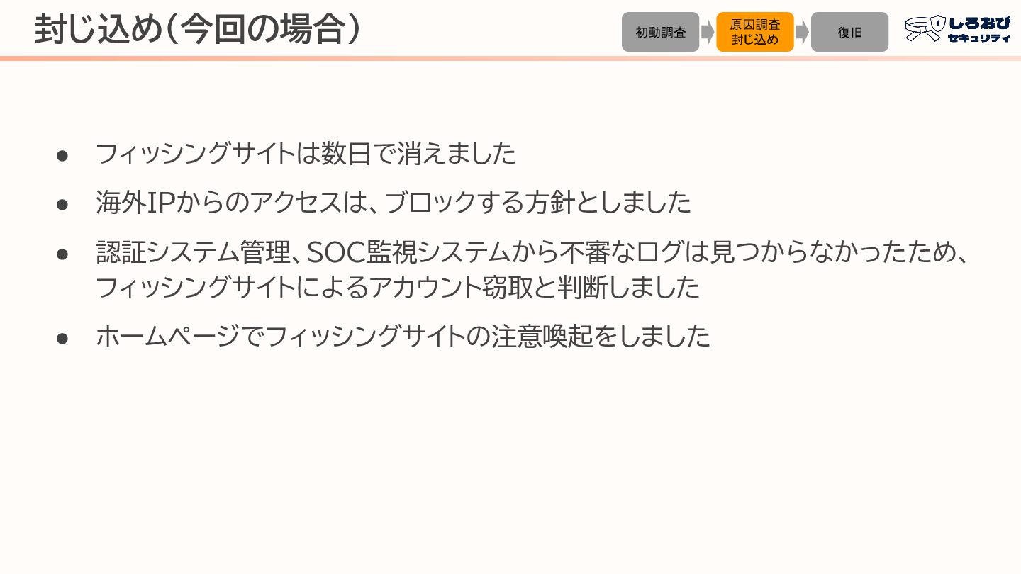 封じ込め(今回の場合) • フィッシングサイトは数日で消えました • 海外IPからのアクセスは、ブロックする方針としました • 認証システム管理、SOC監視システムから不審なログは見つからなかったため、 フィッシングサイトによるアカウント窃取と判断しました • ホームページでフィッシングサイトの注意喚起をしました