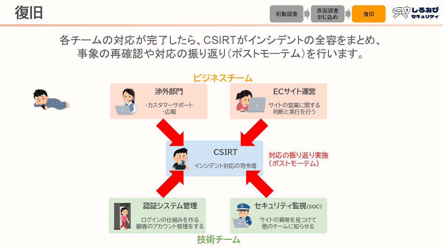 サイトの異常を見つけて 他のチームに知らせる 復旧 ビジネスチーム 技術チーム 各チームの対応が完了したら、CSIRTがインシデントの全容をまとめ、 事象の再確認や対応の振り返り(ポストモーテム)を行います。 CSIRT インシデント対応の司令塔 初動調査 原因調査 封じ込め 復旧 対応の振り返り実施 (ポストモーテム)