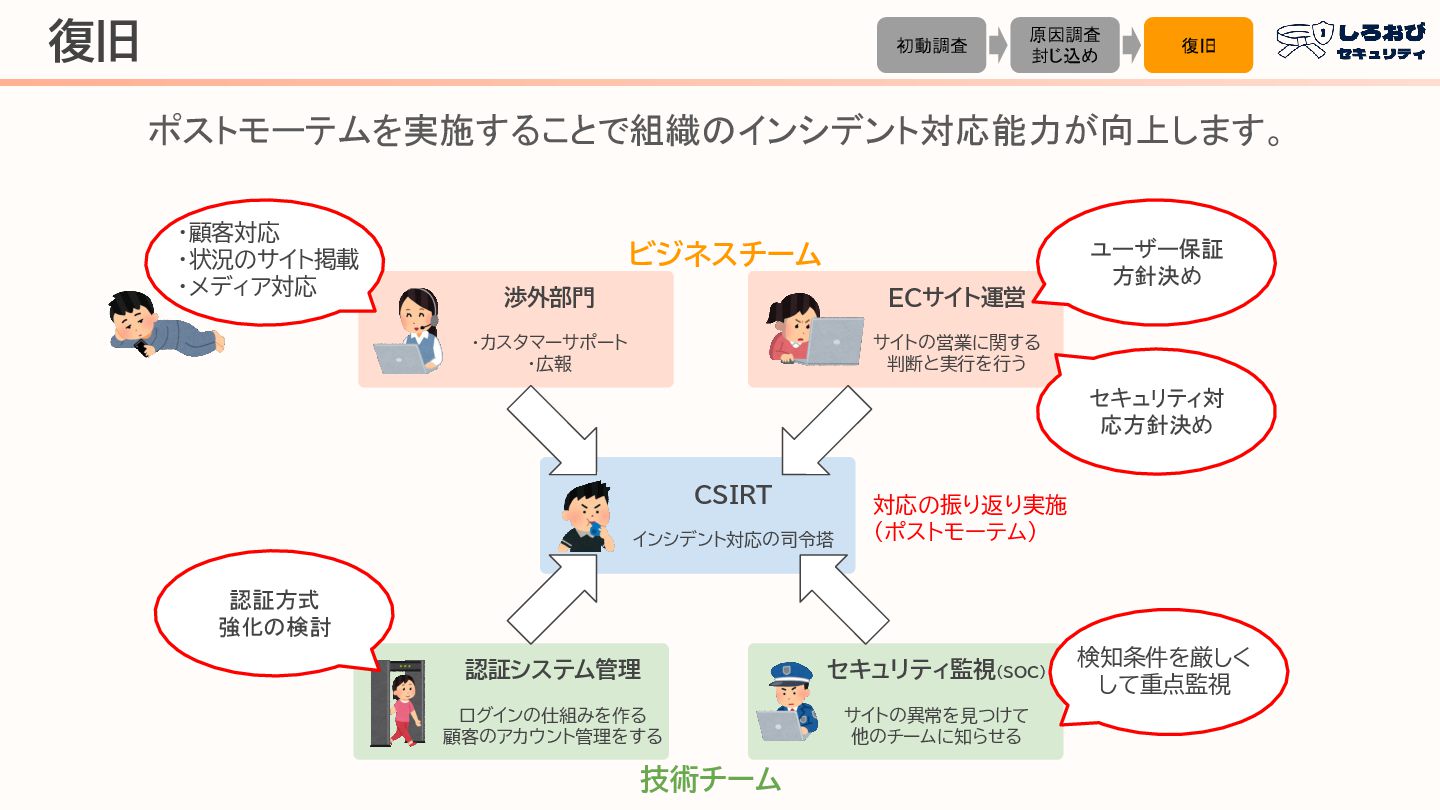 サイトの異常を見つけて 他のチームに知らせる 復旧 ビジネスチーム 技術チーム ポストモーテムを実施することで組織のインシデント対応能力が向上します。 CSIRT インシデント対応の司令塔 初動調査 原因調査 封じ込め 復旧 対応の振り返り実施 (ポストモーテム) ユーザー保証 方針決め 認証方式 強化の検討 セキュリティ対 応方針決め ・顧客対応 ・状況のサイト掲載 ・メディア対応 検知条件を厳しく して重点監視