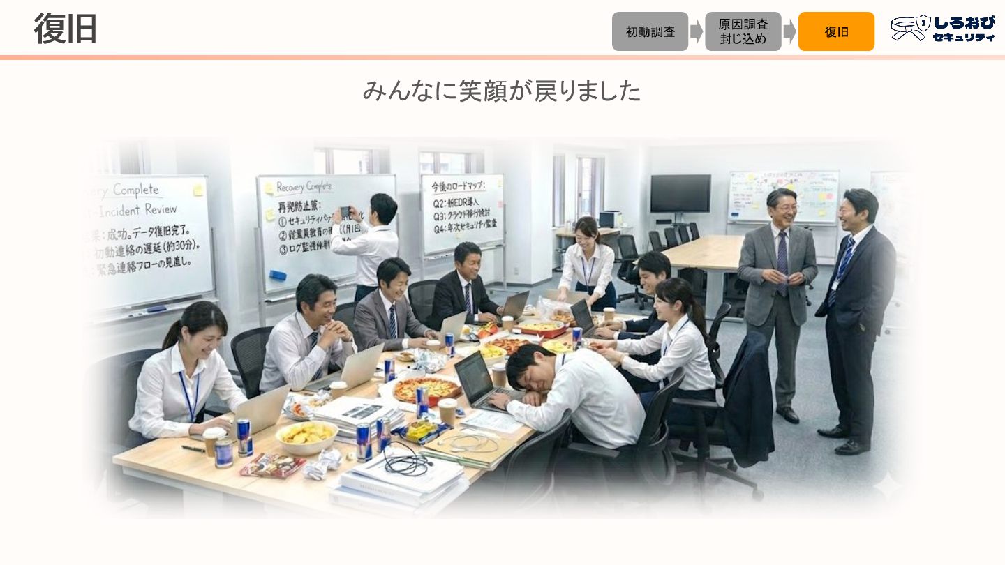 復旧 初動調査 原因調査 封じ込め 復旧 みんなに笑顔が戻りました