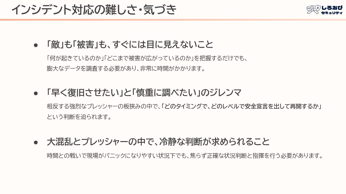 インシデント対応の難しさ・気づき • 「敵」も「被害」も、すぐには目に見えないこと 「何が起きているのか」「どこまで被害が広がっているのか」を把握するだけでも、 膨大なデータを調査する必要があり、非常に時間がかかります。 • 「早く復旧させたい」と「慎重に調べたい」のジレンマ 相反する強烈なプレッシャーの板挟みの中で、「どのタイミングで、どのレベルで安全宣言を出して再開するか」 という判断を迫られます。 •