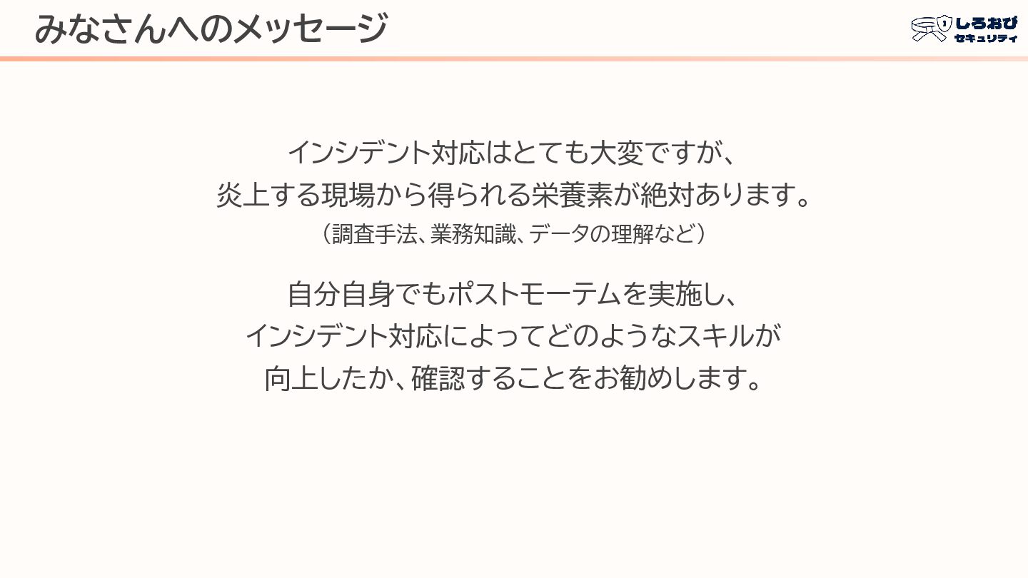 みなさんへのメッセージ インシデント対応はとても大変ですが、 炎上する現場から得られる栄養素が絶対あります。 (調査手法、業務知識、データの理解など) 自分自身でもポストモーテムを実施し、 インシデント対応によってどのようなスキルが 向上したか、確認することをお勧めします。
