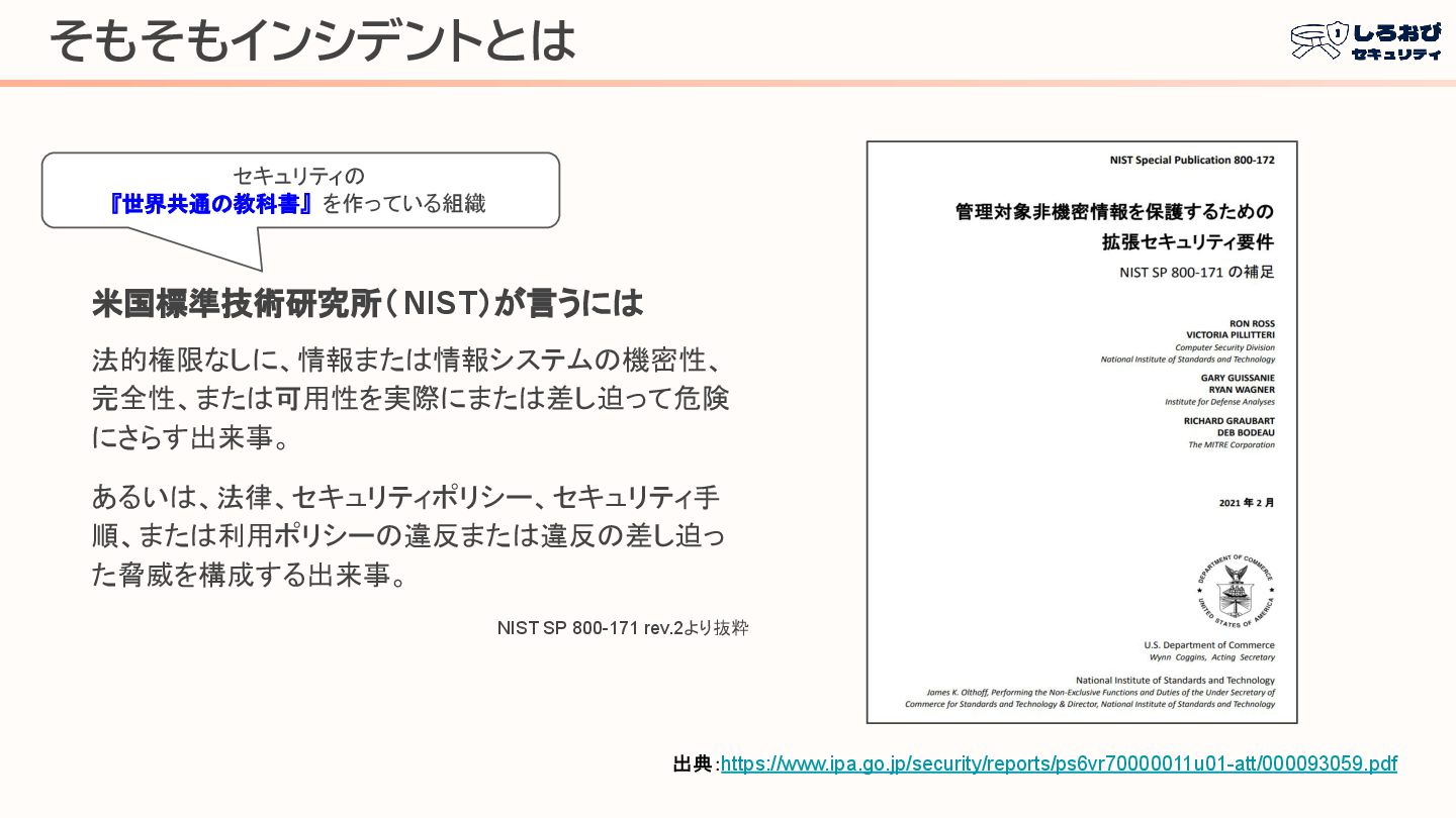 そもそもインシデントとは 米国標準技術研究所( NIST)が言うには 法的権限なしに、情報または情報システムの機密性、 完全性、または可用性を実際にまたは差し迫って危険 にさらす出来事。 あるいは、法律、セキュリティポリシー、セキュリティ手 順、または利用ポリシーの違反または違反の差し迫っ た脅威を構成する出来事。 NIST
