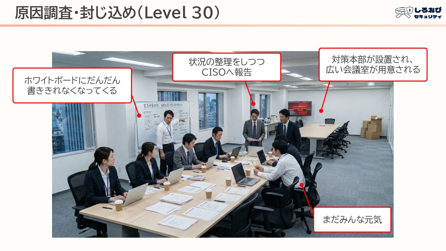 原因調査・封じ込め(Level 30) 対策本部が設置され、 広い会議室が用意される 状況の整理をしつつ CISOへ報告 ホワイトボードにだんだん 書ききれなくなってくる まだみんな元気
