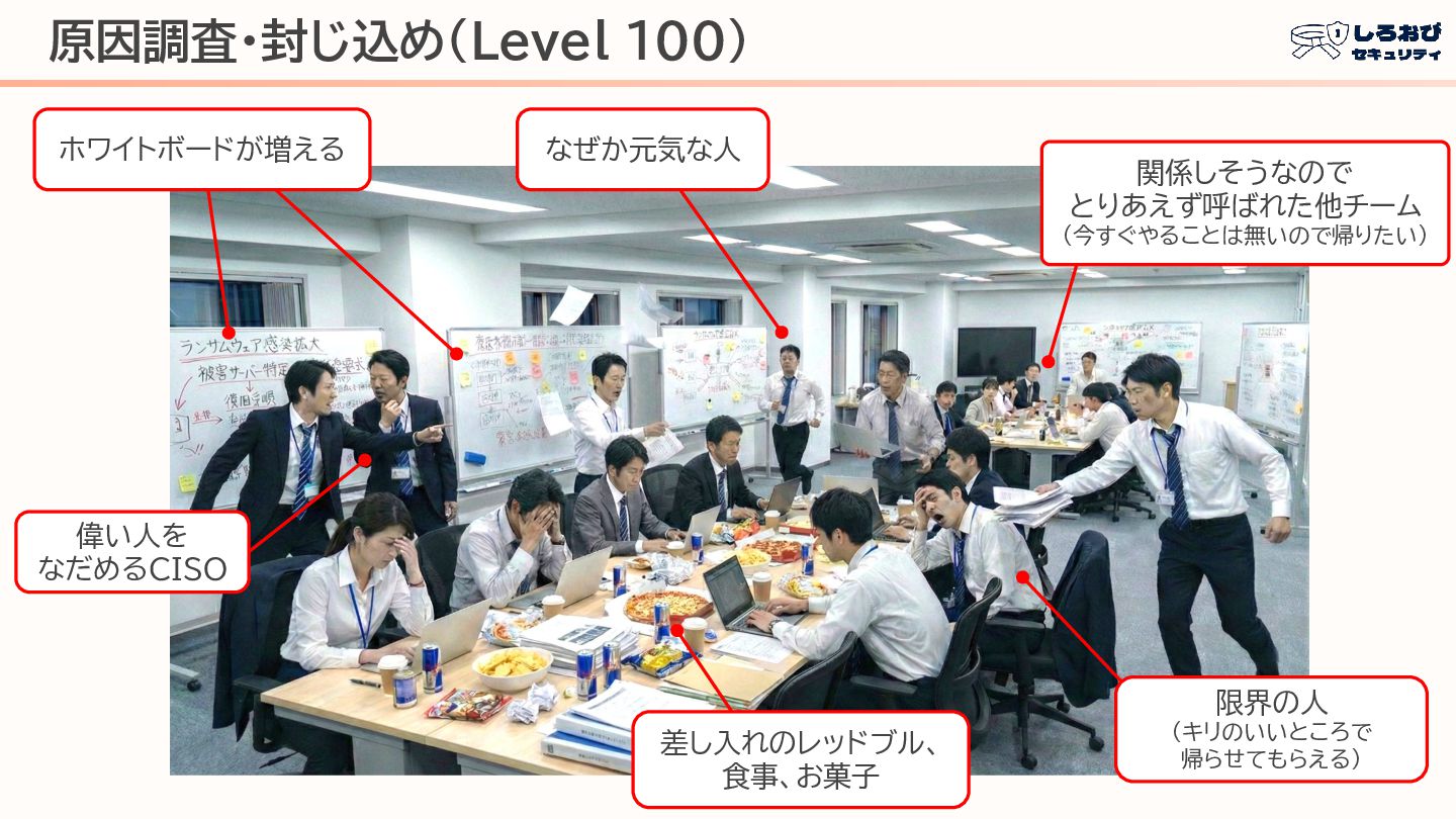 原因調査・封じ込め(Level 100) なぜか元気な人 差し入れのレッドブル、 食事、お菓子 偉い人を なだめるCISO ホワイトボードが増える 関係しそうなので とりあえず呼ばれた他チーム